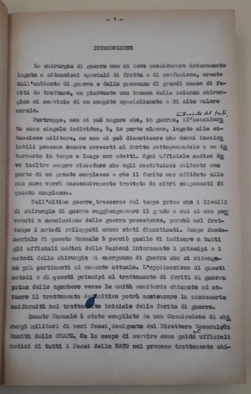 In 8', gr. mz. tela , piatti marm. con tit. applicato al piatto, copia di dispense dattiloscritte suddivise per argomento, per complessive 300 pagine circa;prefaziione dell'A. Wilford F. Hall, Direttore Generale Servizio Sanitario Forze Armate Statunitensi in Europa- Dal quartier Generale delle Forze Alleate in Europa, Parigi, Maggio 1956. in collaborazione di: Andrea Napoleone Te. Col. Med.- Natale Piserchia, Ten. Col. Med.- Slvatore D'Arca, Capitano Med. Volume saldo, ordinari segni del tempo, numerose correzioni a penna nel testo. ***Due to bureaucratic reasons, books dated over 70 years old cannot be immediately exported, please contact us before placing the order.***