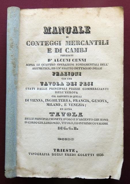 Manuale di conteggi mercantili e di cambj. Preceduti d'alcuni cenni sopra le quattro operazioni fondamentali dell'aritmetica, ed un' esatto dettaglio delle Frazioni con una tavola dei pesi usati dalle principali Piazze Commercianti dell'Europa. Col rapporto di quelli di Vienna, Inghilterra, Francia, Genova, Milano, e Venezia; ed altra Tavola delle principali monete d'oro e d'argento che sono in corso col loro peso, titolo, ed intrinseco valore.