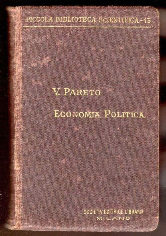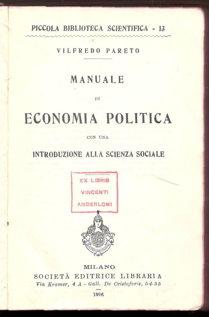 In 24° (cm. 13 x 8,5), pp. XII, 579. Tela editoriale amaranto con titoli oro (bordi scoloriti). Tagli rossi. Con una nota di possesso manoscritta sull'occhietto (datata 1905) e un piccolo timbro rosso (ex libris Vincenti Anderloni) sull'occhietto e sul frontespizio. Copia in buono stato. Il Manuale di Economia Politica può essere considerata come una delle opere fondamentali di Pareto. Piccola Bibloteca Scientifica, 13. Edizione originale. Cfr. Schumpeter, 858-861,987, 1035, 1039 e 1063; Dizionario Bompiani d. Opere, IV, 530.