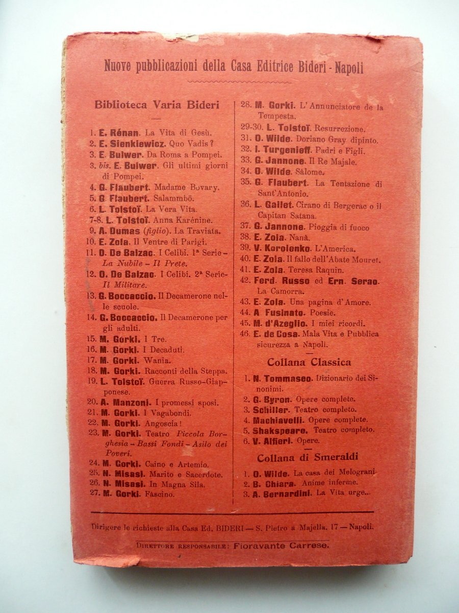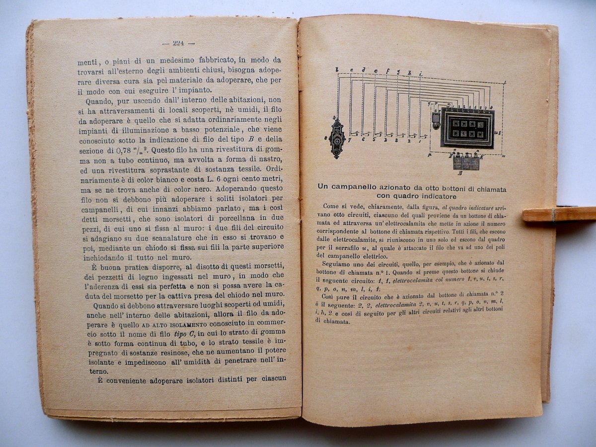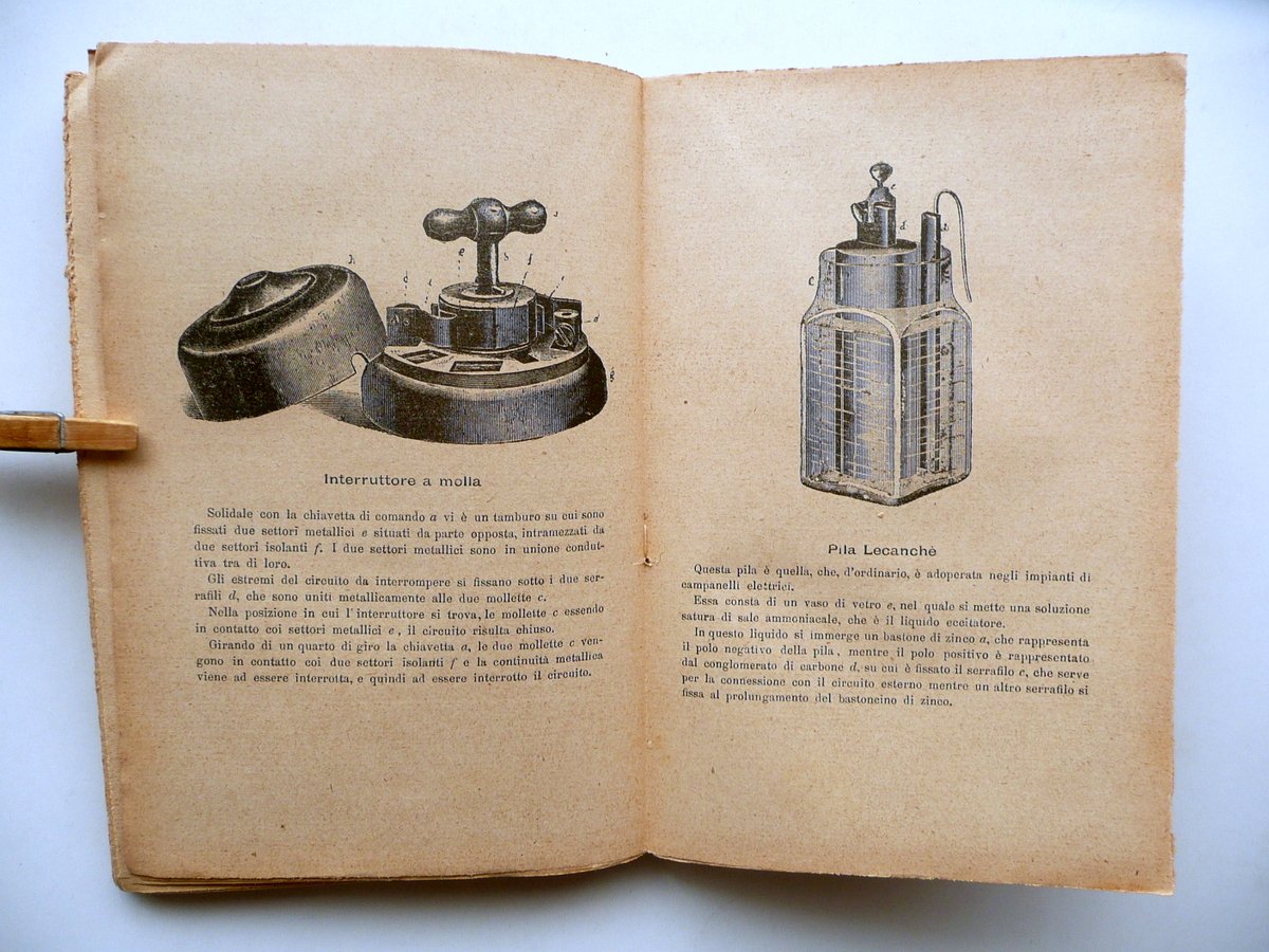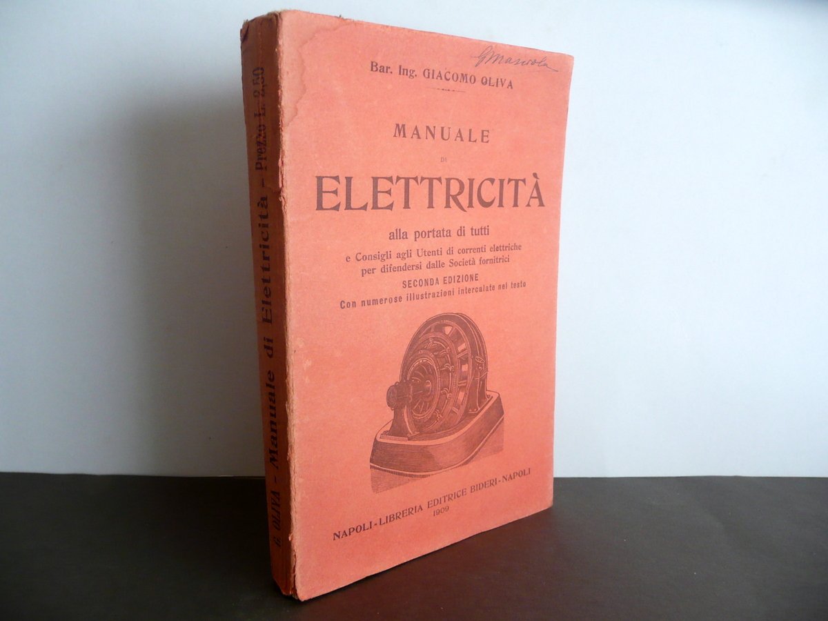 Bar. Ing. Giacomo Oliva, Manuale di Elettricità alla portata di tutti e consigli agli utenti di correnti elettriche per difendersi dalle società fornitrici Seconda edizione con numerose illustrazioni intercalate nel testo Libreria Editrice Bideri, Napoli 1909, cm 19x12,5, pp. I-VIII; pp. 1-264 con alcune ill. in b/n nel t.; brossura ed. Margine sup. della brossura ant. con nome del precedente proprietario annotato a penna nera. Condizioni di conservazione Esemplare in buone condizioni con tracce d'uso, brossure con qualche minima leggerissima abrasione; margine sup. e inf della brossura post. rispettivamente con una minima mancanza e un piccolissimo strappetto; dorso lievemente ingiallito, con una piccola fessurazione e un paio di strappetti alle cuffie; un angolo sup. della brossura ant. con piccola lieve ombra di gora che non interessa le pagine. Interni buoni; angolo sup. delle pp. 185-188 con una piccola mancanza che non interessa il testo; margine est. delle pagine 229-236 rifilato. SETT98.L9273 N