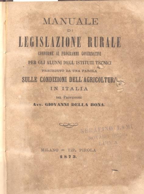 MANUALE DI LEGISLAZIONE RURALE. Conforme ai programmi governativi, per gli alunni degli Istituti Tecnici, preceduto da una parola sulle condizioni dell'agricoltura in Italia.