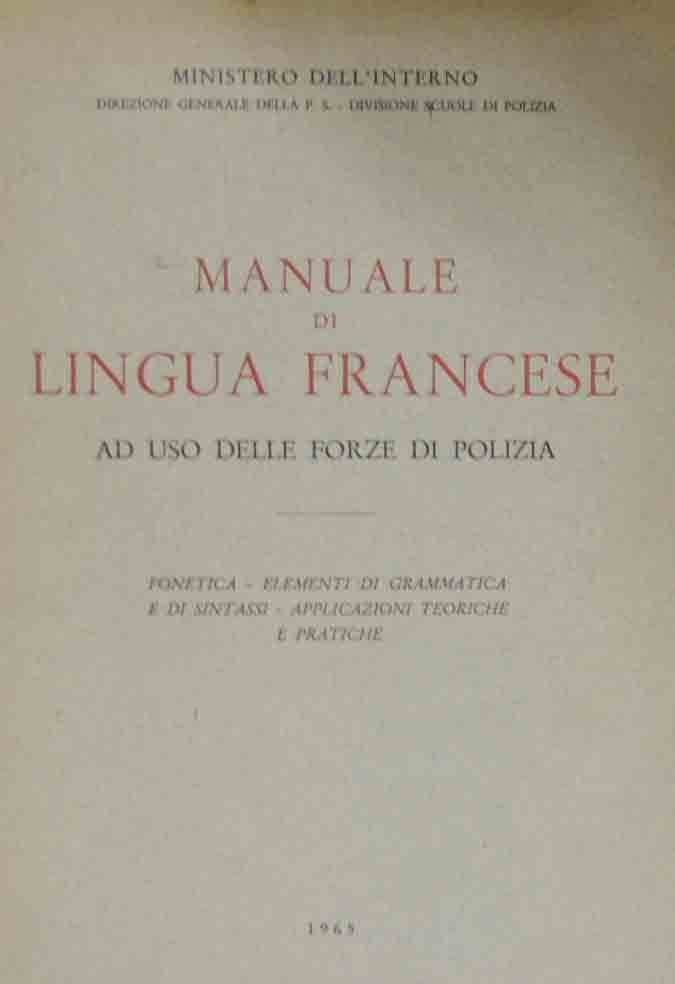Ministero dell’Interno - Direzione generale della P. S. – Divisione Scuole di Polizia, Manuale di lingua francese ad uso delle scuole di polizia. Fonetica, elementi di grammatica e di sintassi, applicazioni teoriche e pratiche, s.n., s.l. (ma stampato a Roma, presso le Arti Grafiche Fratelli Palombi) 1965, pp. 287, 4 c. di tavv. f.t. ill. col., cm 24, br. ed. Minimo strappetto al dorso, qualche traccia di lapis, per il resto ben conservato.