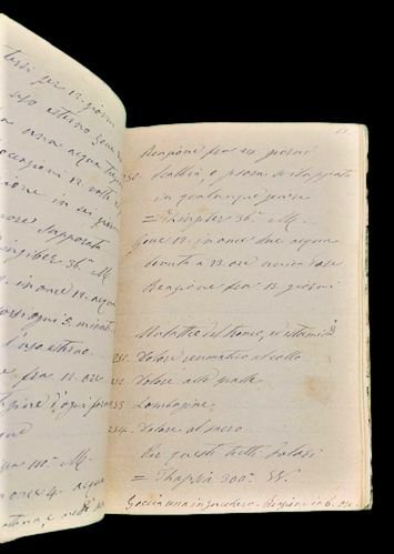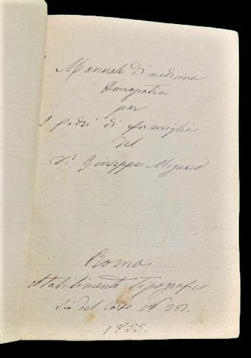 In 8° piccolo; (2 b.), (2), 73, (136 b.) pp. Legatura coeva in mezza-tela marrone con piatti foderati da bella carta marmorizzata coeva. Esemplare in ottime condizioni di conservazione. Copia manoscritta coeva all'edizione a stampa, del rarissimo e celebre trattato omeopatico del dottore, magnetista animale e ipnotista siciliano, Giuseppe Migneco (Augusta 25 marzo 1820 - Catania 1 febbraio 1884), uno dei più celebri medici omeopatici del suo tempo oltre che studioso di magnetismo animale, conosciuto anche con il soprannome di Il Cagliostro Piccolo. Laureatosi in medicina a Catania nel 1842, perfeziona i suoi studi a Napoli. Qui assume la carica prestigiosa di chirurgo della Real Marina. Tornato a Catania segue i corsi di chirurgia ottenendo la laurea in Chirurgia. E' proprio negli ambienti napoletani che Migneco entra in contatto con le nascenti tecniche omeopatiche, portate nelle Due Sicilie, dai medici al seguito delle truppe austriache chiamate da Ferdinando I. Migneco, da sempre interessato alla medicina alternativa e già studioso del magnetismo animale, è tra i primissimi in Italia ad approfondire e divulgare le teorie omeopatiche che vedono il loro massimo sviluppo in Italia, proprio in meridione e fra il 1821 ed il 1870 periodo in cui diverse epidemie di colera affliggono il territorio borbonico. Nel 1854 è a Parigi dove entra in contatto con i circoli omeopatici e mesmerici parigini facendo la conoscenza del Marchese Giorgio Campana che diviene suo sodale amico e ne pagherà la pubblicazione delle opere. Gli inizi letterari di Migneco non sono però facili. L'ostracismo verso la medicina alternativa è moto forte e le autorità napoletane, su segnalazione di un parroco, Vizzini che accusa Migneco di esercitare arte diabolica condannano, il 10 agosto 1858, la sua monumentale opera in sette libri, Fisiologia igienica e patologica, al rogo. Sono proprio le epidemie di colera, però, a segnare una svolta nella vita di Migneco. Persa ogni speranza di fermare il colera, alcuni municipi, si rivolgono a Migneco che contro ogni previsione, probabilmente degli stessi committenti, ottiene risultati sorprendenti, ben superiore a quella degli altri medici chiamati a contrapporsi al male. L'estensore del manoscritto è anonimo ma la scrittura è sempre ben chiara e leggibile. L'opera a stampa, uscita nel 1855 a Roma, è rarissima, in quanto venne stampata in pochissime copie ed in conseguenza delle vicende biografiche dell'autore, tanto che nessun esemplare è oggi censito in ICCU. Il testo è così suddiviso: Il testo è articolato in 264 punti che descrivono, minuziosamente, le ricette omeopatiche, suddivisi in capitoli: Cap.I: "Disordini del dinamismo generale: Emozioni morali, Sonno e sogni, Febbri". Cap.II: "Affezioni diverse: Malattie del capo, Malattie degli organi della respirazione, Malattie degli organi genitali dell'uomo e della donna, Mestruazione, Incomodi della gravidanza, Conseguenze del Vajuolo, Malattie della pelle". Rif. Bibl.: Antonio e Francesco Negro, Bibliografia Omeopatica Italiana, Franco Angeli, 2007, pagina 53 per l'opera a stampa.
