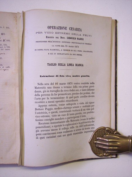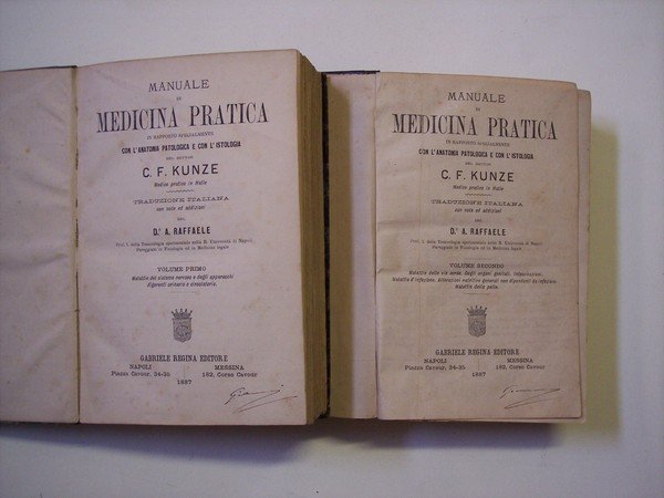 Vol. 1: Malattie del sistema nervoso e degli apparecchi digerenti, orinario e circolatorio.<BR>Vol. 2 : Malattie delle vie aeree. degli organi genitali. Intossicazioni. Malattie d'infezione. Alterazioni nutritive generali non dipendenti da infezioni. Malattie della pelle.<BR>2 voll. di cm. 22,5 x 14; pp. 846, 998; legatura coeva in mezza tela con piatti marmorizzati.<BR>Condizioni buone: lievi abrasioni soprattutto ai margini dei piatti; uno strappetto con piccola perdita alla sguardia del primo volume; lievissimo danno alla cuffia inferiore del 2° volume.<BR>INTERESSANTISSIMO ALLEGATO:<BR>Con i due volumi è stato rilegato 1 opuscolo di ostetricia che illustra un'<BR>"Operazione cesarea per vizio estremo della pelvi eseguita dal Dott. Ludovico Majoni . la notte del 16 marzo 1871.estrazione di feto vivo, madre guarita" in cui si ha intervento con sopravvivenza della madre cinque anni prima della messa a punto del metodo Porro (1876) di pp. 30 + 1 tavola litografata di cm. 39 x 27.