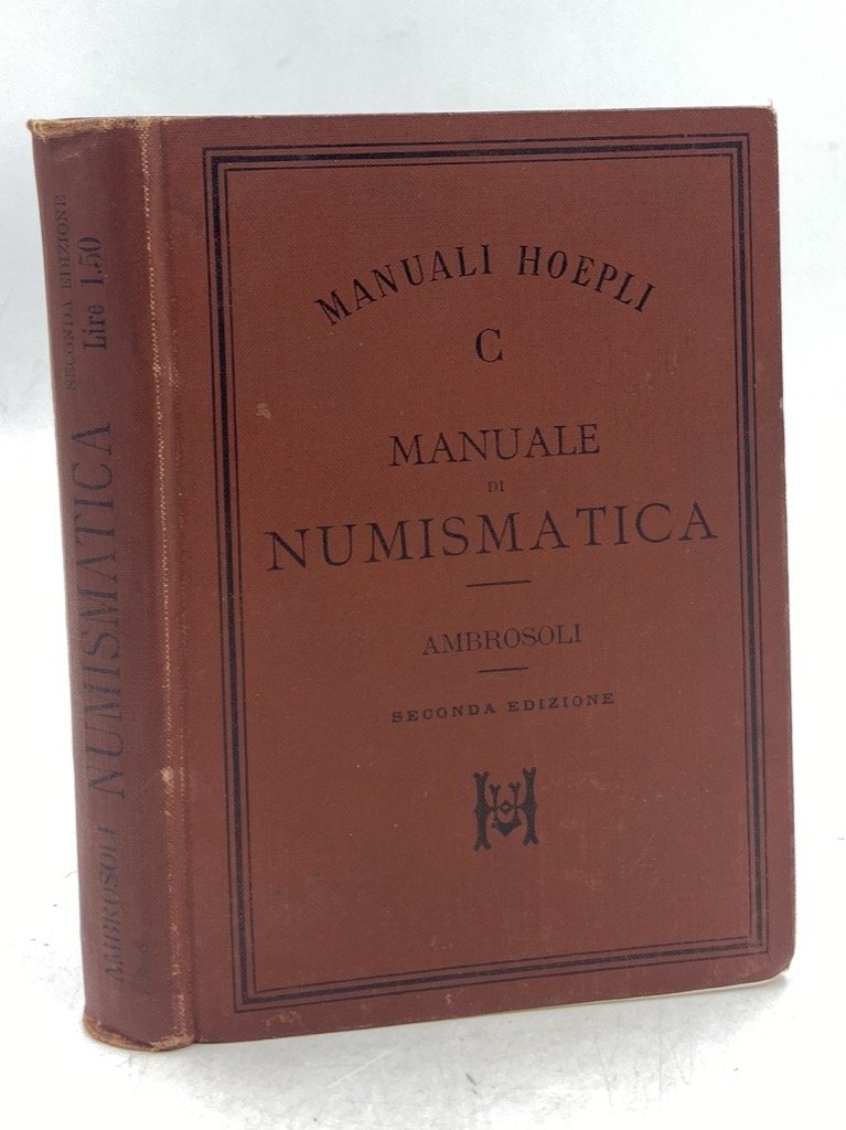 Legatura editoriale in tela mattone, cm 15 x 11, pp XIV (1) 250 (2) illustrate da 120 figure nel testo + 4 tavole doppie; in calce pp 16 in velina rosa con Giudizi della stampa periodica sulla prima edizione del Manuale Ambrosoli e pp 32 di Catalogo editoriale. Buono stato. Seconda edizione di questo classico manuale dello studioso lariano, poi più volte rivisto dall’autore e, più tardi, da Francesco Gnecchi, sempre nella collana dei Manuali Hopeli. Solone Ambrosoli fu erudito studioso di numismatico e prolifico autore e divulgatore della materia, fondando nel 1881 la Gazzetta Numismatica e nel 1888 la Rivista Italiana di Numismatica.