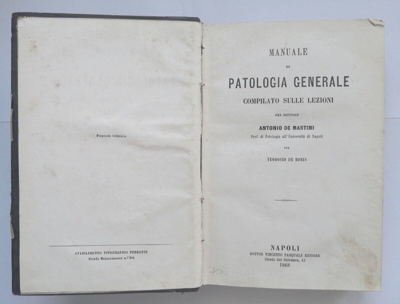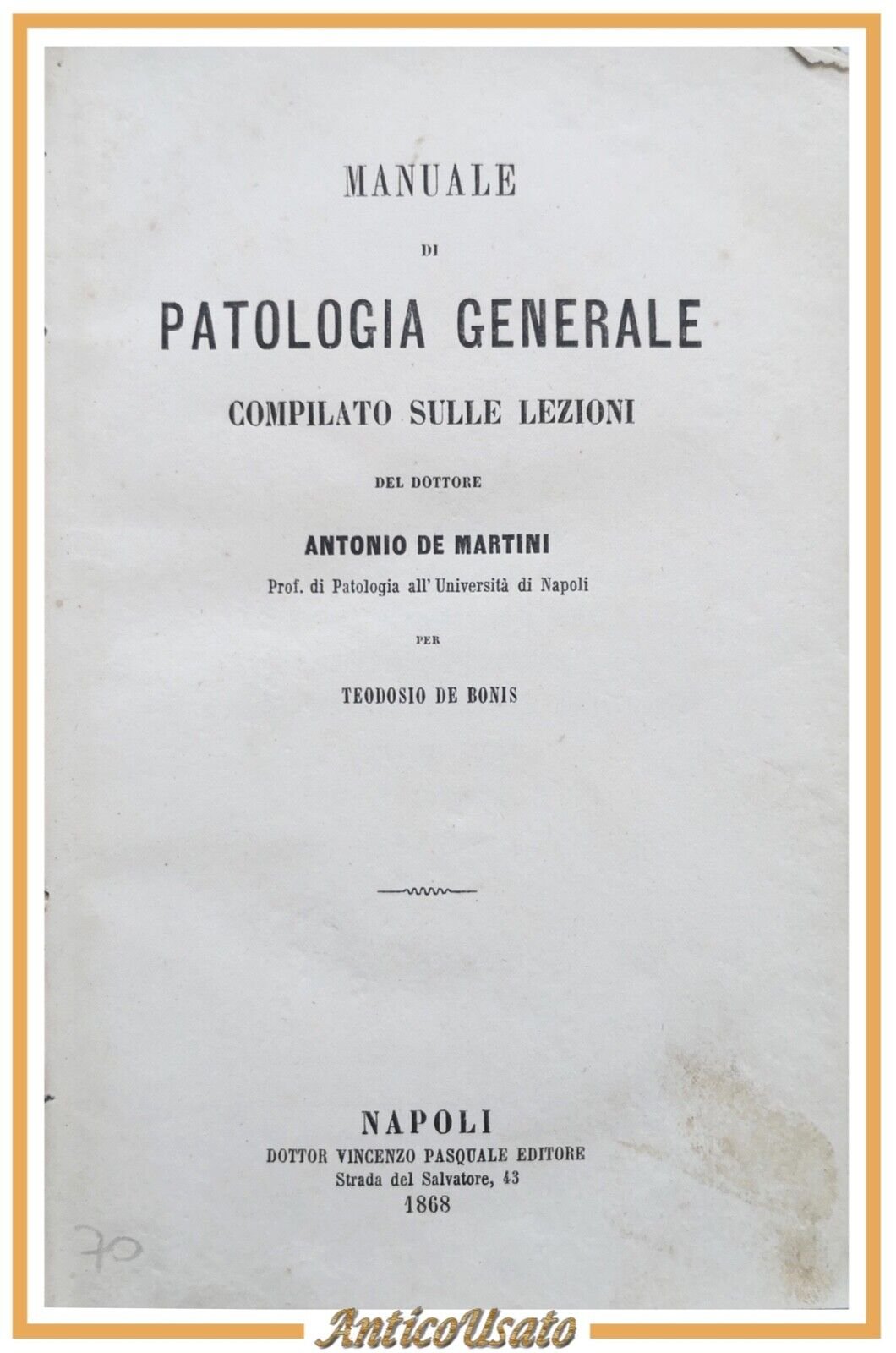MANUALE DI PATOLOGIA GENERALE lezioni di Antonio De Martini 1868 Pasquale Libro
