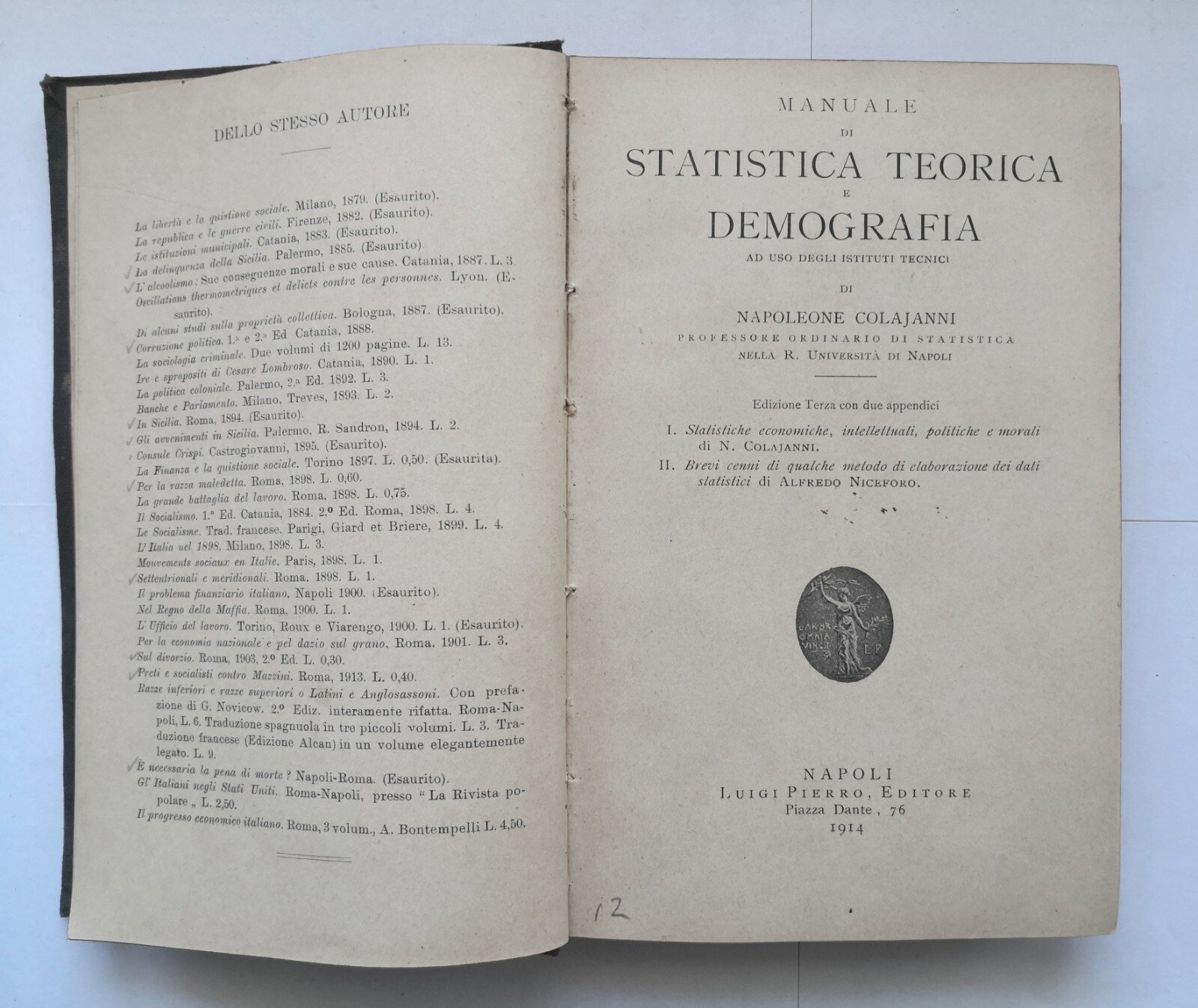 MANUALE DI STATISTICA TEORICA E DEMOGRAFIA di Napoleone Colajanni 1914 Libro