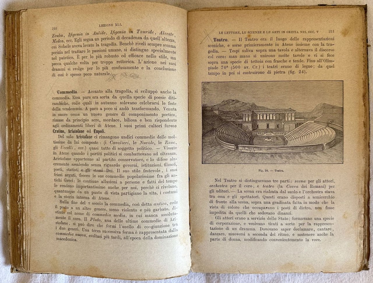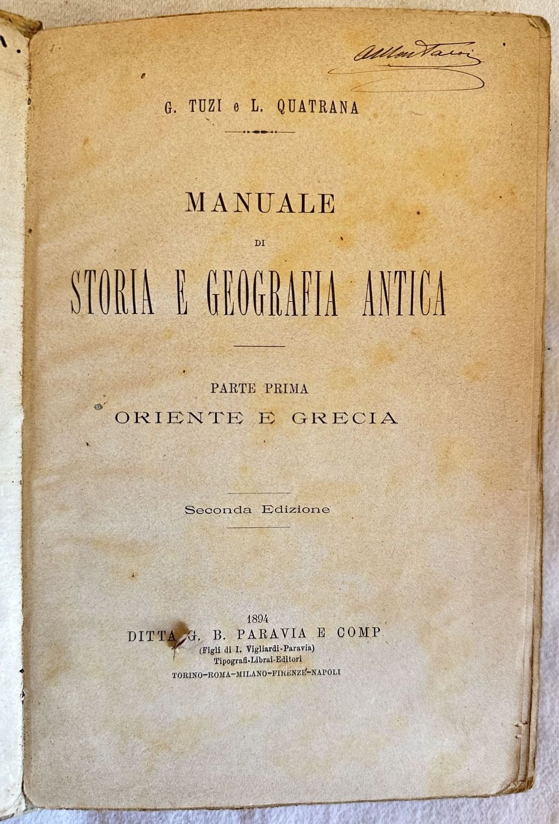Seconda edizione del 1894 di questo manuale di storia e geografia antica scritto da Tuzi e Quatrana. Parte prima solamente sull'Oriente e la Grecia. All'interno: Storia della geografia e delle scoperte geografiche degli antichi, Antico Egitto, Assiri e Babilonesi, Fenici, Israeliti, Medi Persiani, Miti e religione arti lettere e scienze, geografia delle colonie greche, Asia Minore, asia centrale e orientale ecc. Alcune illustrazioni all'interno. Firma al frontespizio. In discrete condizioni. Copertina oin mezza pergamena in discrete condizioni generali con lievi usure ai margini e dorso. Segni di tarlo. Legatura in buone condizioni. Pagine in buone condizioni con rare fioriture. In 8. cm. 22x14,5. Pp. 381.Second edition of 1894 of this manual of ancient history and geography written by Tuzi and Quatrana. First part only about Far East and Greece. Signature in the title page. Some illustrations inside. In fair conditions. Half parchment cover in fair conditions lightly worn in the extremities. Worming. Binding in good conditions. Pages in good conditions with occasional foxing. In 8. cm. 22x14,5. Pp. 381.