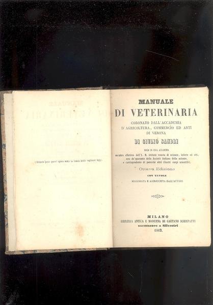 IN 16°, pp.372, RILEGATURA D'EPOCA : DORSO IN TELA, PIATTI MARMORIZZATI RIGIDI. DUE<BR>TAVOLE INCISE + v.r. in b/n. - TAV.1, PROPORZIONE DEL CAVALLO. TAV.2, PROPORZIONE DEL TORO. MANUALE DI VETERINARIA DI GIULIO SANDRI, SOCIO DELL'ACCADEMIA DI AGRICOLTURA DI VERONA, MEMBRO EFFETTIVO DELL'I. R. ISTITUTO VENETO DI SCIENZE, LETTERE ED ARTI, UNO DEI QUARANTA DELLA SOCIETA' ITALIANA DELLE SCIENZE E CORRISPONDENTE DI PARECCHI ALTRI ILLUSTRI CORPI SCIENTIFICI. OTTAVA EDIZIONE CON TAVOLE, MIGLIORATA E ACCRESCIUTA DALL'AUTORE. OPERA FACENTE PARTE DELLA BIBLIOTECA SCELTA DI OPERE ITALIANE ANTICHE E MODERNE, VOL. 336.<BR>OTTIMA CONSERVAZIONE GENERALE ID 5058
