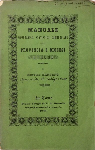 In-8 (mm. 232x147), brossura orig. (picc. mancanze al dorso), pp. XX,308, con 1 bella tavola fuori testo inc. in rame che raffigura la cattedrale di Como. Introdotto da brevi cenni storici intorno alla città, il Manuale contiene: Repertorio di tutti i comuni e frazioni della Provincia - Situazione astronomica e topografia - Compartimento territoriale di ciascun distretto - Amministrazione camerale - Organizzazione giudiziaria - Istruzione e beneficenza pubblica - Sanità - Industria e commercio - Militare - Gerarchia ecclesiastica, chiese parrocchiali e santuari - Arti liberali - Araldica - Curiosità. Testo marginoso, ben conservato.