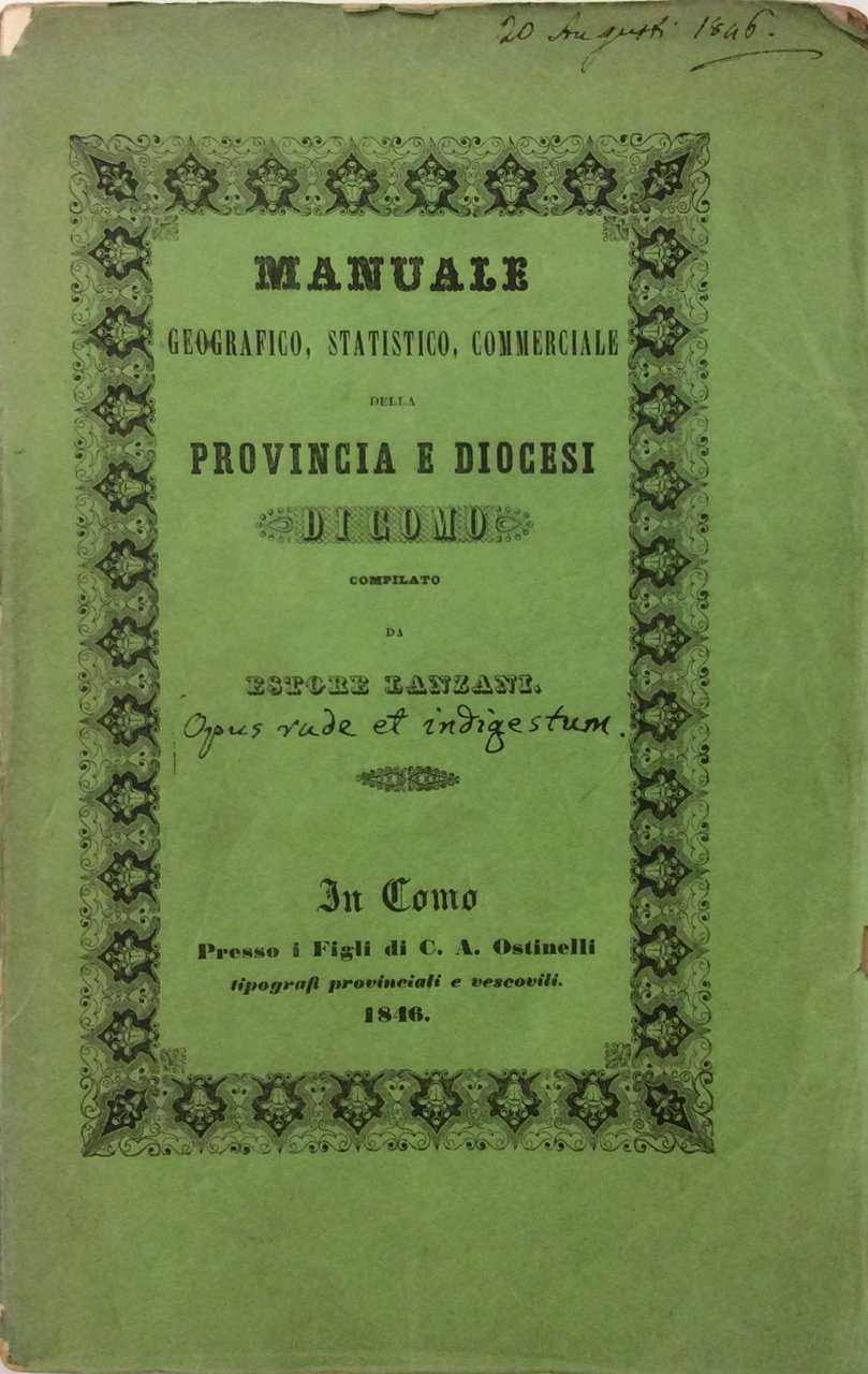 MANUALE GEOGRAFICO STATISTICO COMMERCIALE E DIOCESANO DELLA PROVINCIA DI COMO. - Dedicato all'Ill.mo e Rev.mo Mons. Carlo Romanò, Vescovo di Como. Lavoro di E. Lanzani, Cav. dell'Italico Ordine della Corona di Ferro...
