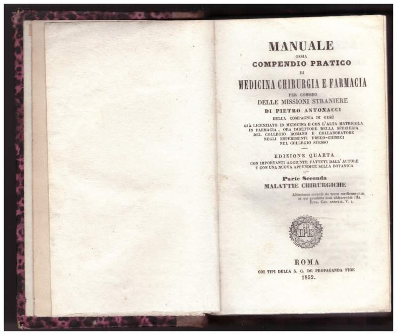 MANUALE OSSIA COMPENDIO PRATICO DI MEDICINA CHIRURGIA E FARMACIA per comodo delle missioni straniere. Parte seconda (1852)