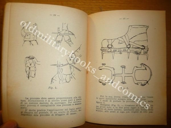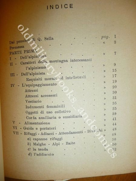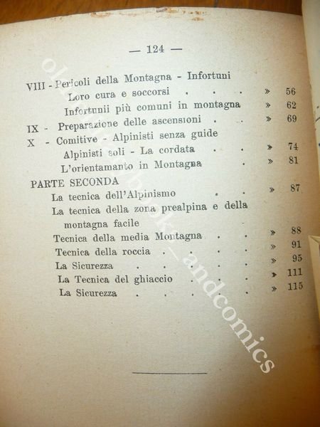 DESCRIZIONE: Luciano Morpurgo Ed. Roma 1931, br. ed. ill. col. da E. Lenti con scena alpinistica, pp. 124 in 16° 32 figure n.t. . Prima edizione di questo manuale di tecnica alpinistica scritto da un tenente colonnello degli Alpini. Sono premessi alcuni pensieri sull'alpinismo di Quintino Sella; segue la trattazione tecnica, relativa a equipaggiamento e alimentazione dell'alpinista, guide e portatori, rifugi e bivacchi, baite e malghe, tende, l'addiaccio, pericoli della montagna e infortuni, comitive, cordate, l'orientamento in montagna, tecnica della zona prealpina, della media e dell'alta montagna, tecnica della roccia e del ghiaccio. CONDIZIONI: Discrete, cop. parzialmente staccata alla parte alta, da incollare. PESO / WEIGHT: 100 gr. without package