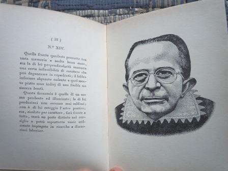 Moizzi editore, s.d. (anni '70), leg. ed. tela bordeax con nome dell'autore in bianco al dorso, sovraccoperta, in 16°, pp. non numerate (116). Ristampa delll'edizione del 1811. Con 32 ritratti dei soggetti descritti (Agnelli, Berlinguer, Moro, Paolo VI, Moravia e altri politici). PREFAZIONE DI UMBERTO ECO. Lievi fioriture in copertina, interno ottimo.