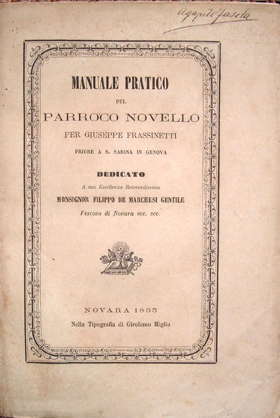 Manuale pratico del parroco novello per Giuseppe Frassinetti Priore di S, Sabina in Genova. Dedicato a Sua Eccellenza Reverendissima Monsignor Filippo De Marchesi Gentile Vescovo di Novara ecc. ecc.