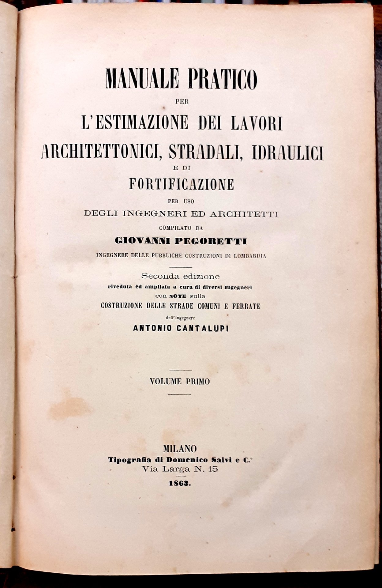 MANUALE PRATICO PER L'ESTIMAZIONE DEI LAVORI ARCHITETTONICI, STRADALI, IDRAULICI E DI FORTIFICAZIONE PER USO DEGLI INGEGNERI ED ARCHITETTI, compilato da GIOVANNI PEGORETTI INGEGNERE DELLE PUBBLICHE COSTRUZIONI IN LOMBARDIA. Seconda edizione. riveduta ed ampliata a cura di diversi ingegneri / con note sulla costruzione delle strade comuni e ferrate di Antonio Cantalupi.