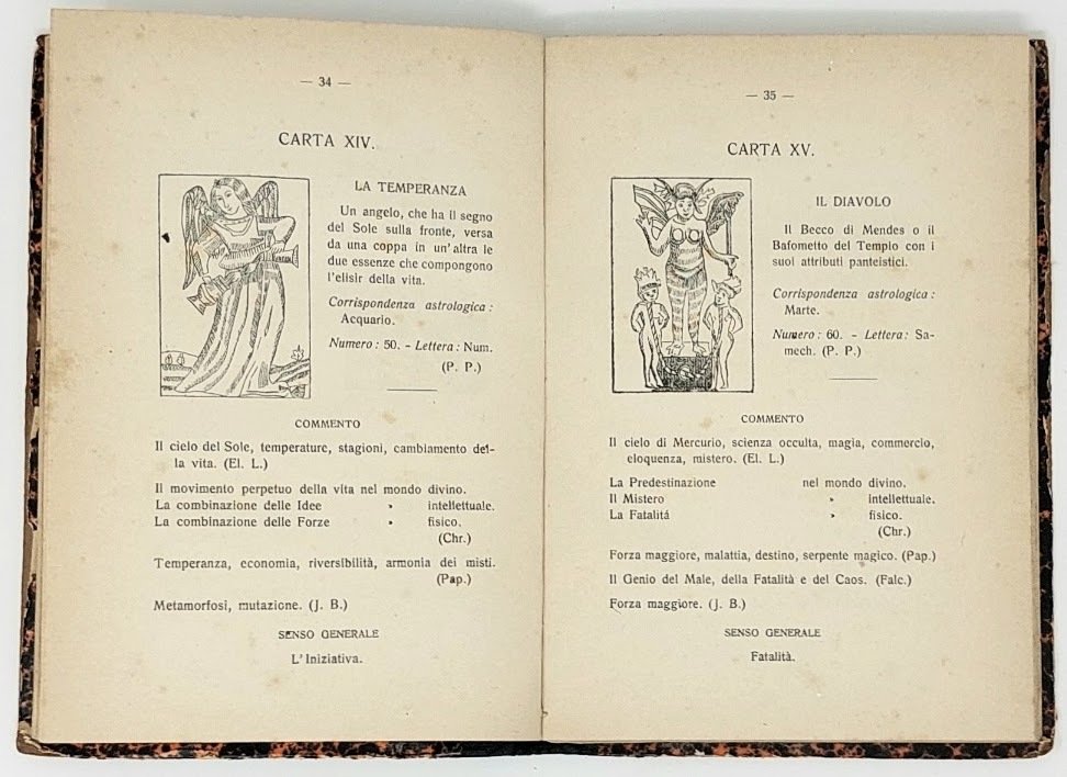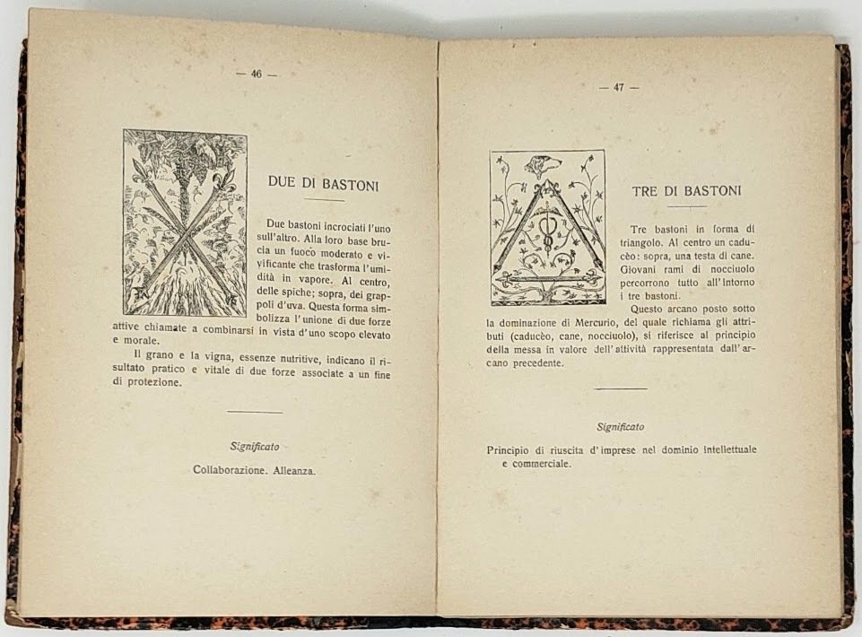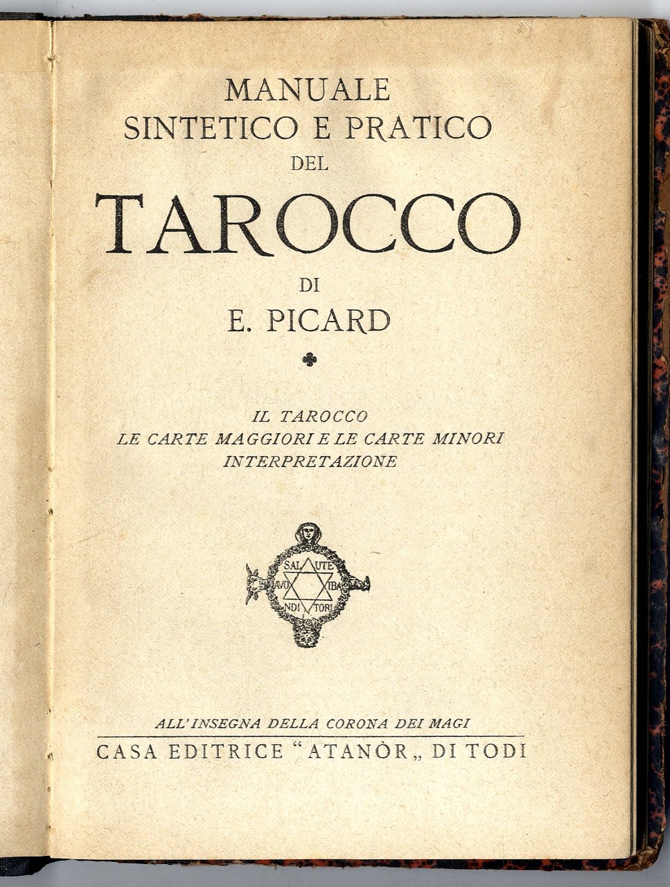 >In-8, pp. (3) 106, (1), quasi ogni pagina illustrata da una carta dei tarocchi, seguendo l'iconografia dei Tarocchi di Marsiglia. Legatura in mezza tela, firma di appartenenza in inchiostro rosso alla prefazione. Volume della collana «All'insegna della corona dei magi», nella prima parte approfondisce il significato degli Arcani Maggiori e poi Minori, nella seconda parte esplica la manipolazione dei tarocchi ed i metodi per leggerli. Prima edizione italiana di opera tutt'ora ristampata. Buon esemplare.