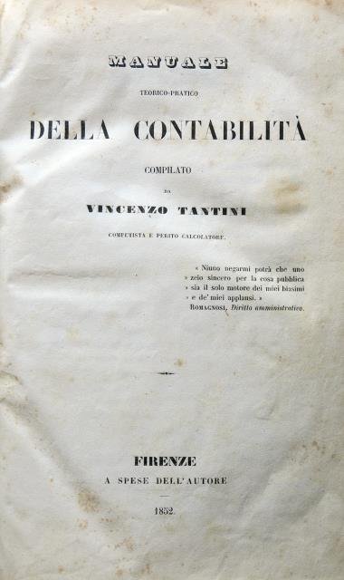 Firenze, a spese dell'Autore, 1852. In 8vo grande, pp. 511 con Indici, leg. in mz. pelle e punte con dorso in pelle verde, titoli e fregi oro, piatti in cartonato rosso. Alcune fioriture e un poco più macchiato sull'ultima carta dell'Errata Corrige, ma in buona legatura e ben conservato.