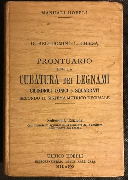 Manuali Hoepli – MANUALE PER LA CUBATURA DEI LEGNAMI CILINDRICI, CONICI E SQUADRATI SECONDO IL SISTEMA METRICO DECIMALE (…) Sedicesima Edizione rifatta ed accresciuta con importanti aggiunte per la cubatura delle conifere, il rilevo dei boschi e generali a cura dell'Ing. Luigi Chiesa.