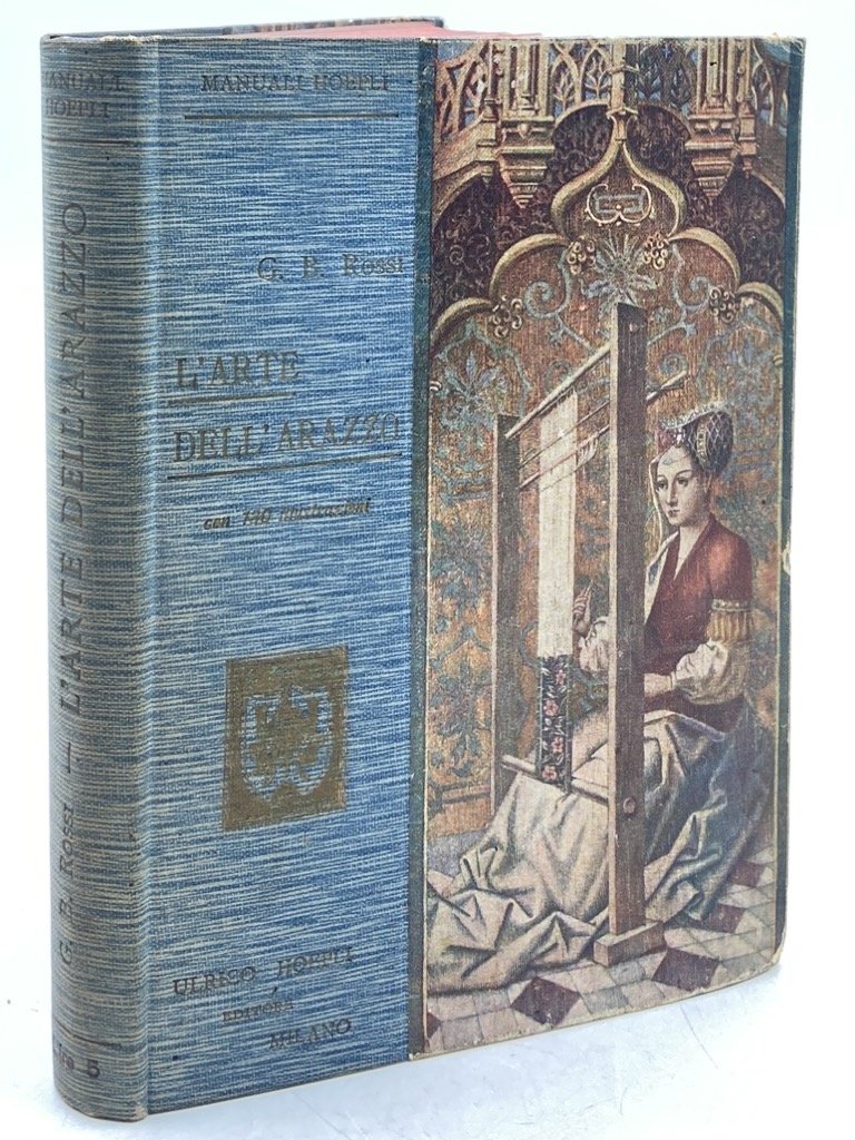 Legatura editoriale illustrata, cm 15 x 11, pp XVI 259 (1) con 130 illustrazioni in nero, in fine legato catalogo editoriale «900 Manuali Hoepli pubblicati al 1° aprile 1907» di pp 64. Edizione originale e unica di questo Manuale Hoepli dedicato all’arazzo, con prefazione di Ugo Ojetti. Il volume è stampato dall’Italia Industriale Artistica di Roma, con copertina di Erulo Eroli e fregi di Duilio Cambellotti. L’opera si apre con una sezione di Cenni storici, contiene un repertorio di Marche e monogrammi delle manifatture (tratto da La Tapisserie di Muntz), un glossario tecnico del telaio ad alto liccio, una sezione di istruzioni tecniche sul montaggio del telaio e la tessitura dell’arazzo illustrata da figure al tratto e fotografie di arazzieri delle manifatture di San Michele e di Erulo Eroli di Roma, e una bibliografia. In calce un indice degli arazzi riprodotti, delle località e degli artisti citati. Esistono di questo manuale due versioni, differenti per il colore della tela utilizzata per la copertina, bianca o, come in questo esemplare, azzurra.