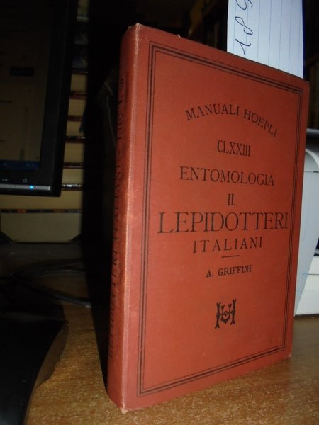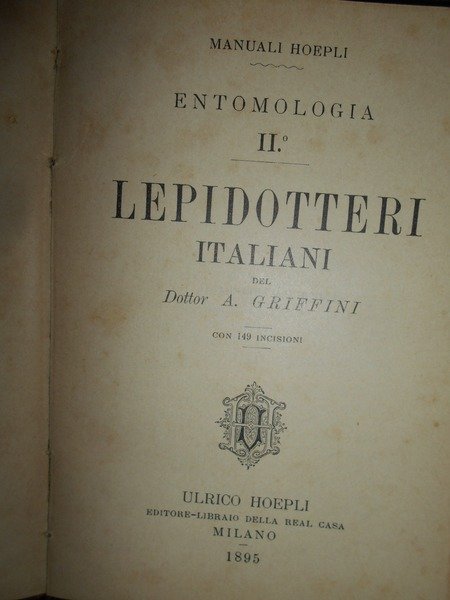 A. Griffini. Milano, Ulrico Hoepli, 1895. Lepidotteri Italiani. Prima edizione. In-16°, tela edit. 238 pp. con 149 incisioni. In fine 32 pagine del catalogo dei manuali Hoepli pubblicati sino al 1894. Ottimo esemplare. Neg. Hoepli. mob. 19