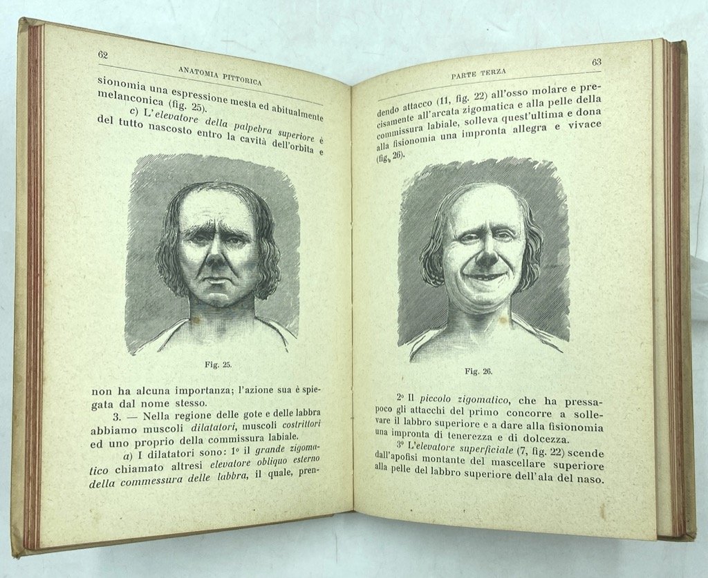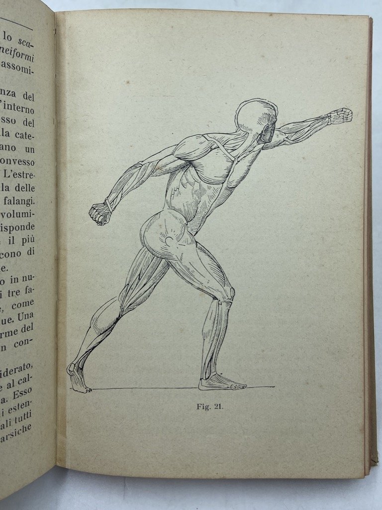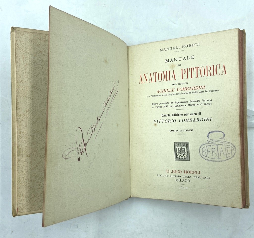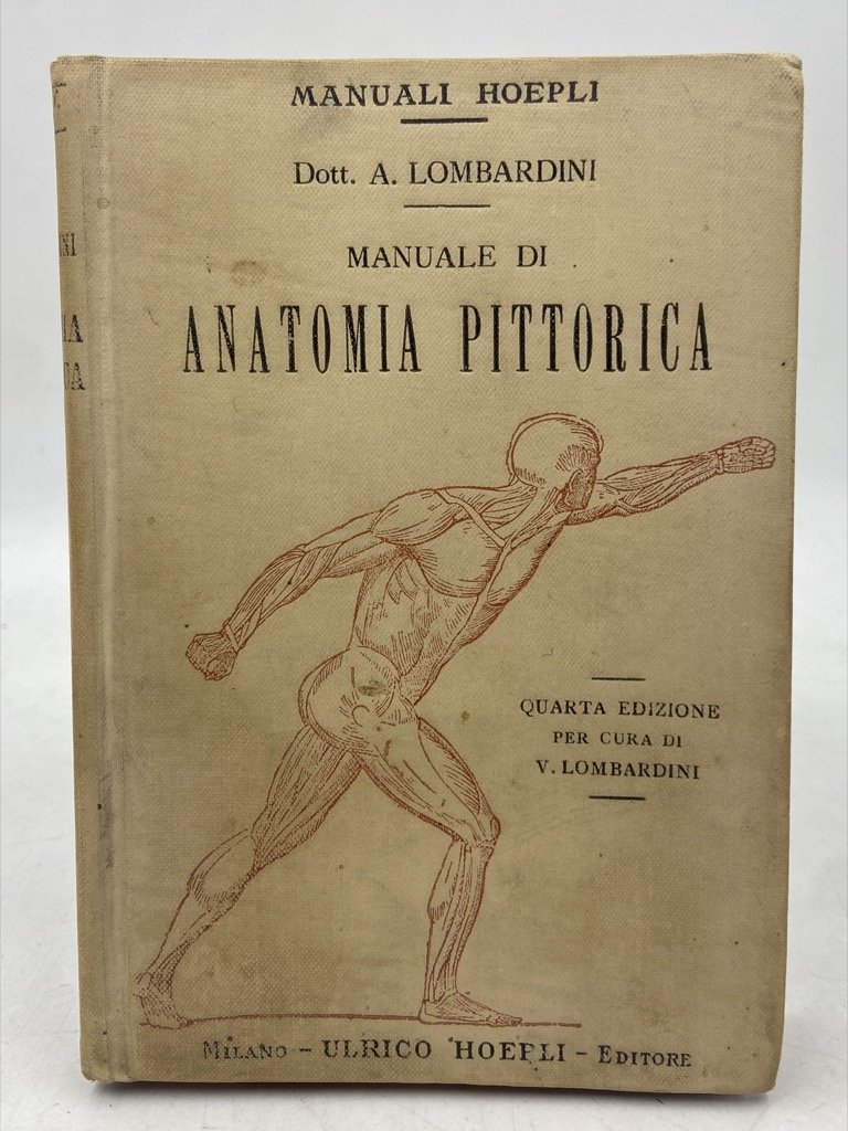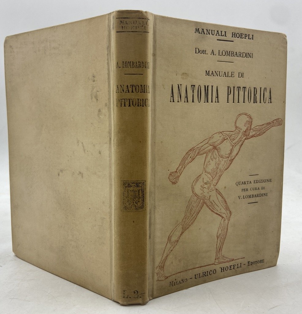 Legatura editoriale illustrata in tela color crema con titoli in nero e figura in sanguigna, cm 15 x 10.5, pp XII 195 (1), 56 figure in nero nel testo e su due tavole ripiegate; in calce legato catalogo editoriale di pp 84 «1300 Manuali Hoepli pubblicati al 1° gennaio 1914». Buono stato, firma e timbro di privata proprietà rispettivamente all’antiporta e sul frontespizio, minimi segni del tempo. Quarta edizione del manuale di anatomia artistica che Achille Lombardini, docente all’Accademia di Belle Arti di Carrara, pubblicò per la prima volta nel 1886 e rivedette nel 1897 ottenendo la Medaglia di Bronzo all'Esposizione di Torino nel 1898. L'opera fu rivista per la terza edizione del 1906 dal figlio dell'autore, Vittorio, che ordinò ed espanse gli appunti sull'espressione, e aggiunse cenni storici e bibliografici sulla disciplina.