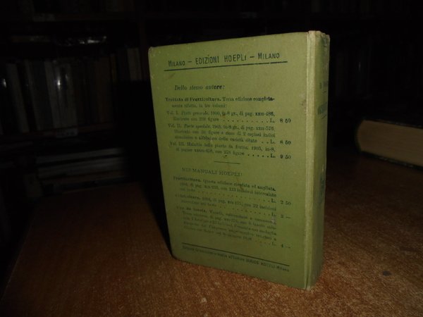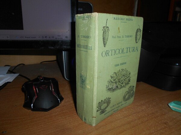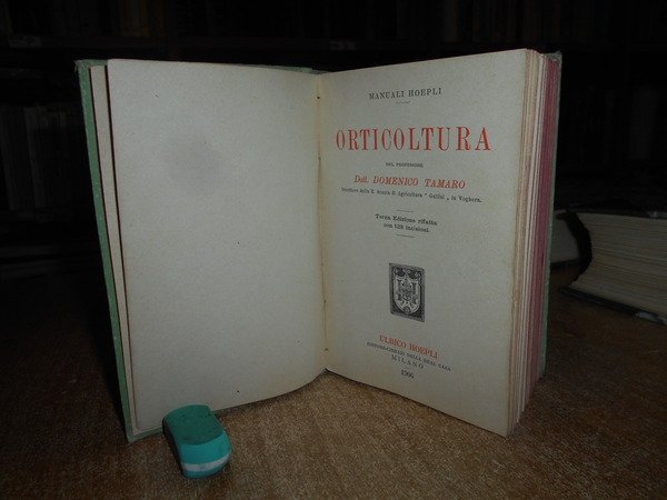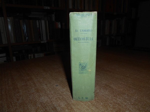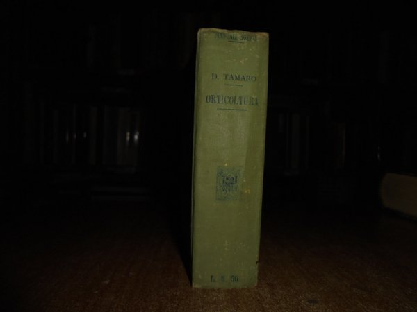 (Manuali Hoepli) Dott. DOMENICO TAMARO. Milano, Ulrico Hoepli Editore, 1906. ORTICOLTURA. Terza edizione. In-16° piccolo, tela edit. illustrata. xvi, 597, (64 pp. Manuali 900 Hoepli Pubblicati a tutto Ottobre 1906), con 128 incisioni. Ottimo esemplare con lievi normali segni del tempo alle copertine. Nef. mob. bianco piccolo vetrina