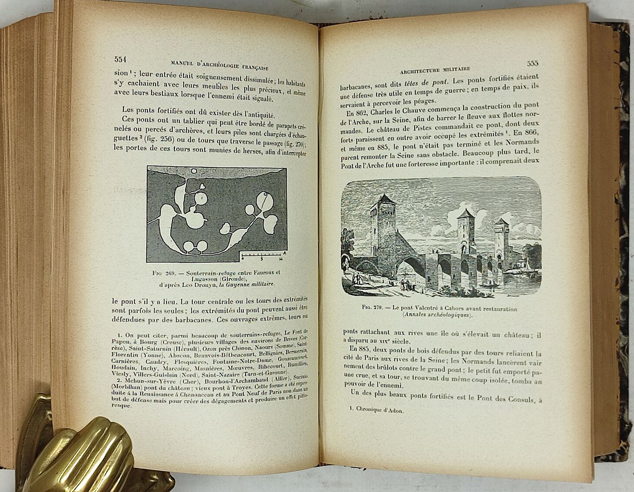 2 volumi (uno dedicato all'architettura religiosa ed uno all'architettura civile e militare) dell'opera 'Manuel D'archeologie francaise depuis les temps merovingiens jusq'a la Renaissance' di Camille Enlart. Nello specifico, si tratta del tomo I ('Architecture religieuse') e del tomo II ('Architecture civile et militaire') della premiere partie dell'opera, dedicata all'architettura. formato: 14,5 x 22 cm circa. Volumi ricchissimi di incisioni in nero nel testo e di tavole fuori testo (48 nel tomo I e 62 nel tomo II). Stato di conservazione: si segnalano abrasioni, tagli e piccole mancanze sui margini delle copertine (in particolare sui brodi dei dorsi in pelle), due sigle (di antico proprietario) a pastello blu sul margine superiore del primo foglio dei due volumi, un appunto in elegante calligrafia sul margine inferiore di pagina 5 del primo tomo ma, nel complesso, due ottimi esemplari. Molto freschi. Un ultimo caoitolo del tomo II è dedicato all'architettura navale. Copertine cartonate con piatti marmorizzati e dorso in pelle. Nervi in rilievo, titoli e fregi in oro sul dorso.
