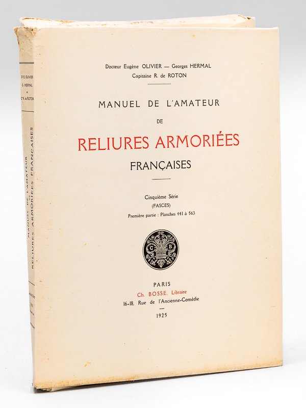 1 vol. in-4 en feuillets sous chemise rempliée, Ch. Bosse, Paris, 1925, 5e série, Planches 441 à 563 Bon état pour ce cinquième volume de l'incontournable Manuel de l'Amateur de Reliures Armoriées Françaises d'Olivier, Hermal et Roton (chemise lég. frottée, très bon état par ailleurs).