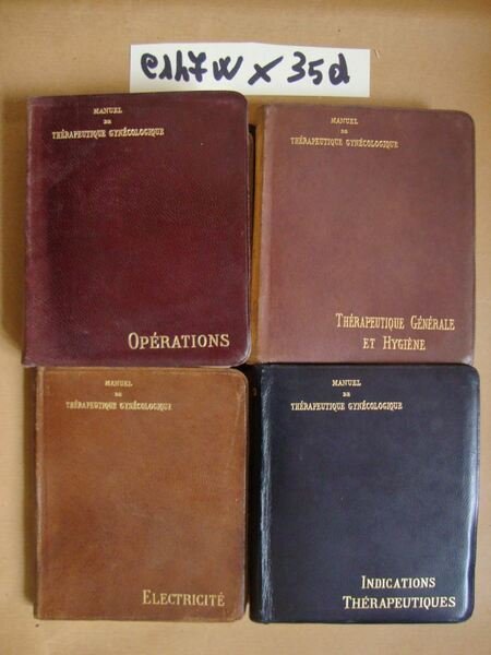 Manuale di terapia ginecologica, suddiviso per argomento nei seguenti 4 tomi: 1. Indications therapeutiques (Dr. A. Auvard - pp. XI-303), 2. Hygiene de la femme et therapeutique generale (Dr. Edmond Caubet - pp .IV-215, 1 fig. bn. nt.), 3. (manca in questa raccolta), 4. Operations (Dr. Berlin - pp. XVIII-482, con figg. bn. nt.), 5. Electricité (Dr. Touvenaint - pp. 136, con figg. bn. nt.) - Tutti i voll. editi nel 1894, con testo in francese - DETTAGLIO DELLE CONDIZIONI : Vol. 1: fioriture all'interno; vol. 2: dorso scolorito; vol.3 mancante; vol. 4: dorso scolorito e fioriture all'interno; vol. 5: dorso scolorito, lievi segni da uso alla coperta e fioriture all'interno - (35d).