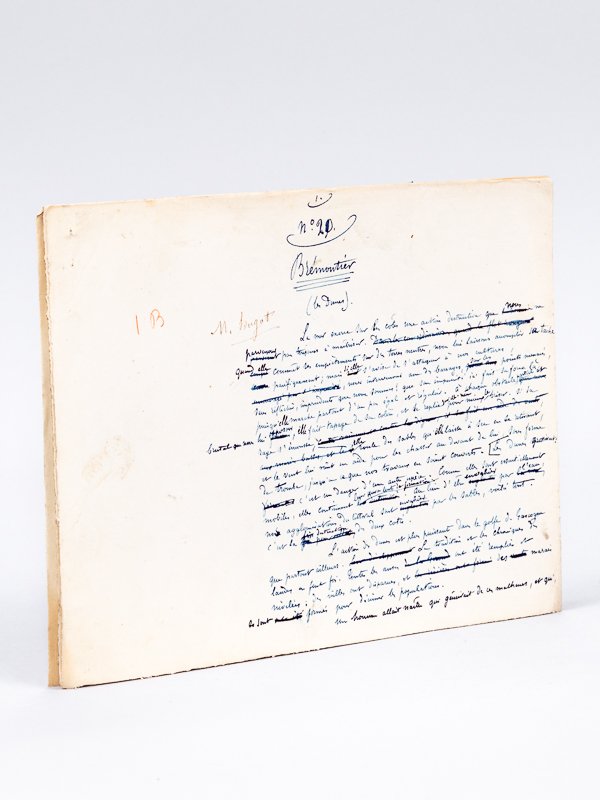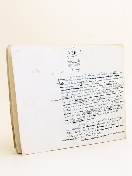 1 manuscrit autographe signé de 9 ff. rédigés au recto, format à l'italienne, s.d. (circa 1862) Le texte en a été publié dans l'ouvrage "Le Panthéon des Hommes Utiles", par Gustave Chadeuil et -Hippolyte Lucas, E. Dentu, 1862, pp. 247-258 Ecrivain et journaliste français né à Limoges en 1823, Gustave Chadeuil, publia vite des romans et nouvelles dans une foule de journaux. Entré au Siècle comme critique musical, il sera l'un des fondateurs du Journal le XIXe siècle en 1871. Il rédigea le "Panthéon des Hommes Utiles" en collaboration avec Hippolyte Lucas, chaque auteur se partageant les biographies. Dans ce manuscrit autographe du chapitre consacré à l'ingénieur français Nicolas Brémontier (1738-1809), célèbre pour avoir fixé les dunes de Gascogne, on observe de nombreuses corrections et repentirs de l'auteur. Bon état (noms des typographes et abréviations destinées à l'imprimeur portés en marge)