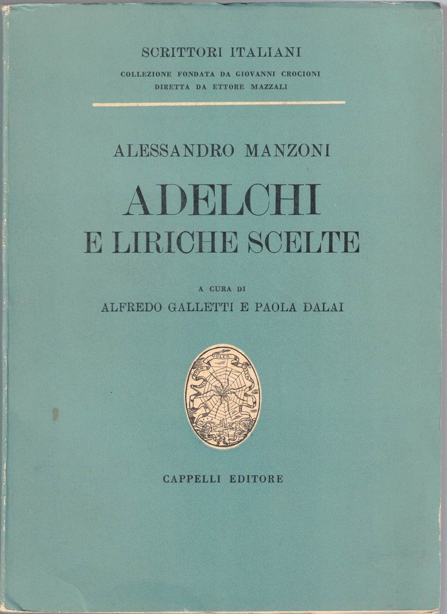 Alessandro Manzoni, Adelchi e altre liriche scelte, a cura di Alfredo Galletti e Paola Dalai, Cappelli Editore, s.l. (ma stampato a Imola, presso la Coop. Tip. Paolo Galeati) 1962, pp. 311, cm 21, br. ed. Collana Scrittori italiani. Indice: Alessandro Manzoni e le sue liriche – In morte di Carlo Imbonati – Il Natale – La Passione – La Risurrezione – La Pentecoste – Il Nome di Maria – Marzo 1821 – Il Cinque Maggio – La Battaglia di Maclodio – L’Adelchi – Notizie storiche – Adelchi. Alla terza di copertina, timbro Omaggio – Assoc. Italiana Editori – Puglia. Minime tracce d’uso, lievissima brunitura della carta, per il resto perfetto.