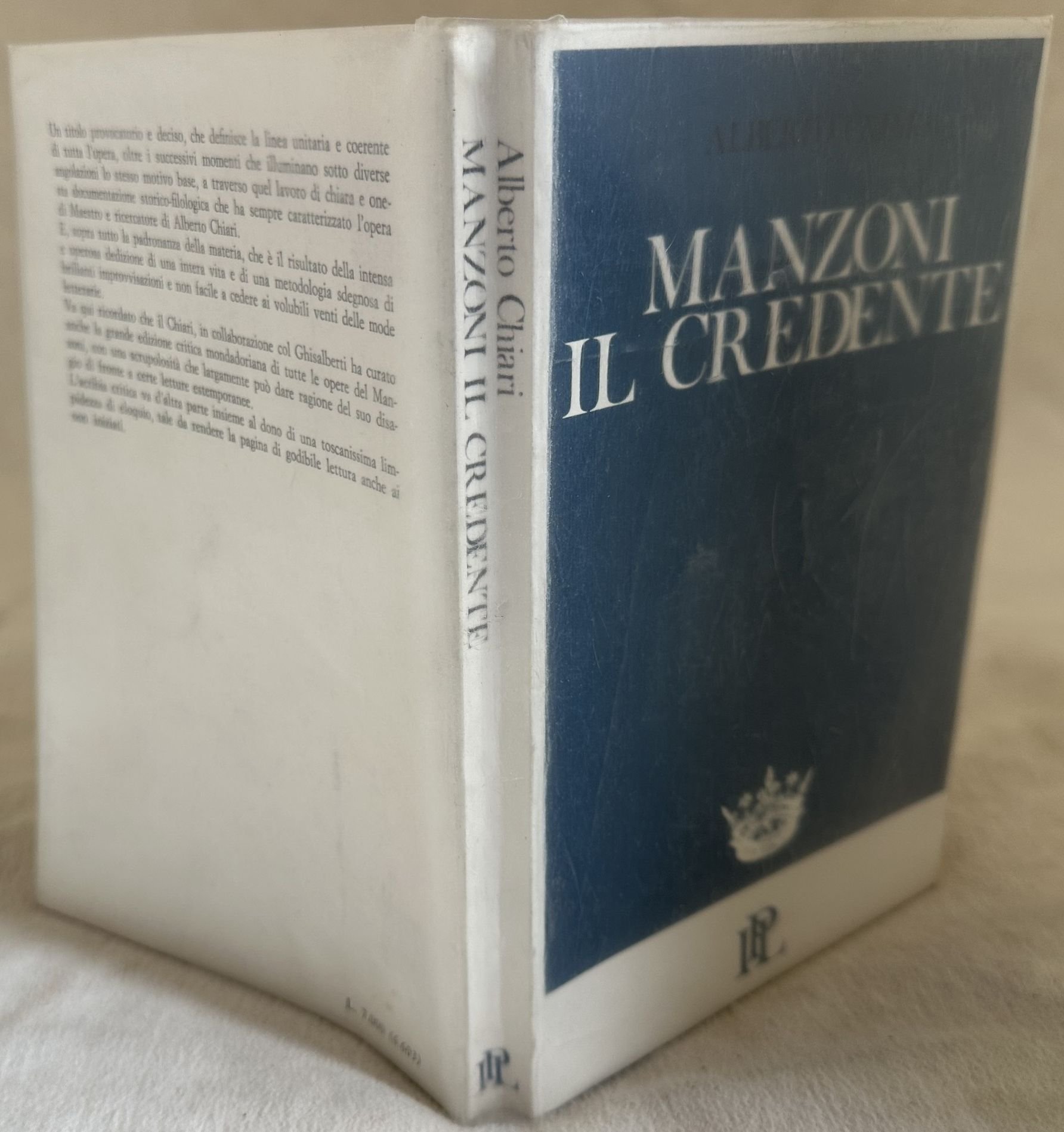Edizione del 1979 di questa monografia su Manzoni e il suo legame con la religione scritto da Alberto Chiari. Alcune sottolineature a matita colorata nel testo. In buone condizioni. Copertina editoriale con sovraccoperta protettiva in buone condizioni con lievi usure ai margini e dorso. Legatura in buone condizioni. Pagine in ottime condizioni con rare fioriture. Segni di nastro adesivo ai contropiatti. In 8. cm 21x14 cm. Pp. 269+(3). Edition of 1979 of this monography about Manzoni and his lying with religion written by Alberto Chiari. Some coloured undelinings in the text. In good conditions. Editorial cover with protective dustjacket in good general conditions lightly worn in the extremities. Binding in good conditions. Inside pages are in very good conditions with occasional foxing. Signs of adhesive tape in the counterplates. In 8. cm 21x14 cm. Pp. 269+(3). <BR>