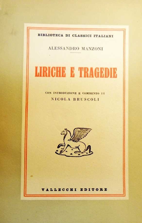 Alessandro Manzoni, Liriche e tragedie, con introduzione e commento di Nicola Bruscoli, Vallecchi Editore, Firenze 1950, pp. VIII, 249, cm 19, br. ed. Collana Biblioteca di classici italiani. Sulla quarta di copertina, stampata la dicitura “Esemplare di saggio”. Etichetta con segnatura di collocazione al dorso, leggere tracce d’uso alla brossura, pagine lievemente ingiallite, frontespizio e prima pagina di testo staccate ma presenti nel testo, per il resto buona copia.
