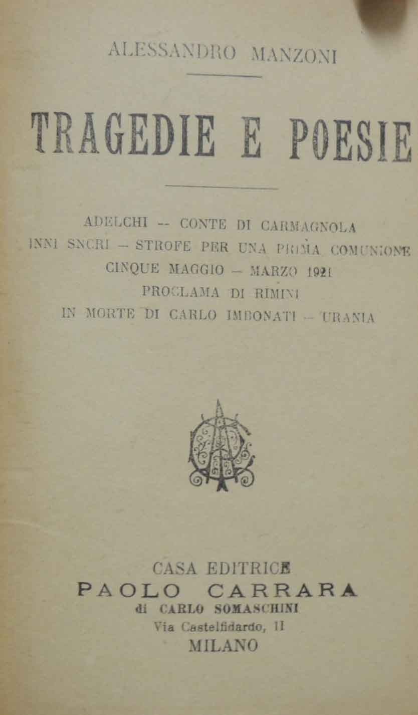 Alessandro Manzoni, Tragedie e poesie. Adelchi – Conte di Carmagnola – Inni sacri – Strofe per una prima comunione – Cinque maggio – Marzo 1821 – Proclama di Rimini – In morte di Carlo Imbonati – Urania, Casa Editrice Paolo Carrara di Carlo Somaschini, Milano s.d., pp. 263, cm 19, legatura in tela ed. con titoli in oro al dorso e al piatto. Tracce d’uso, cerniere interne dei piatti rinforzate, uniforme ingiallitura della carta, ma nel complesso copia ancora in condizioni più che accettabili e perfettamente fruibile.
