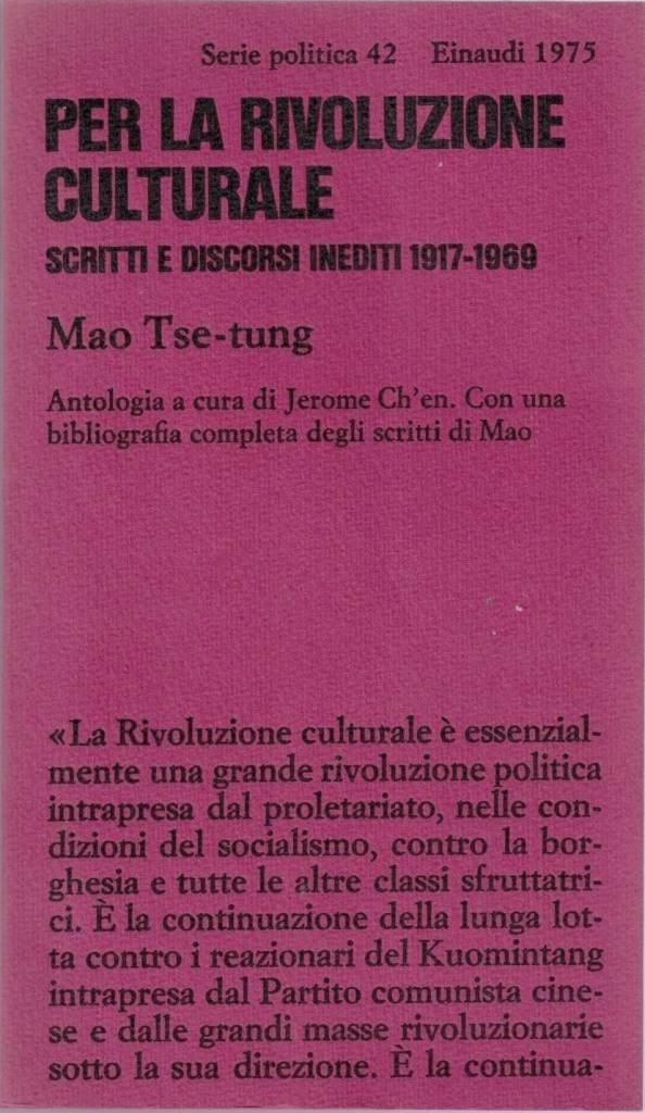 Mao Tse-tung (Mao Zedong), Per la rivoluzione culturale. Scritti e discorsi inediti 1917-1969. Antologia a cura di Jerome Ch’en. Con una bibliografia completa degli scritti di Mao, nota introduttiva di Enrica Collotti Pischel, Giulio Einaudi editore s.p.a., Torino 1975, pp. LV, 234, cm 18, br. ed. Collana Serie politica, vol. 42. Tradotto dall’edizione inglese edita dalla Oxford University Press con il titolo Mao papers. Anthology and biography. Traduzione dall’inglese di Lucio Ristori. Minimo alone di nastro adesivo alla prima carta dell’indice e alla penultima carta di testo (contenente l’elenco dei volumi della collana), per il resto perfetto.