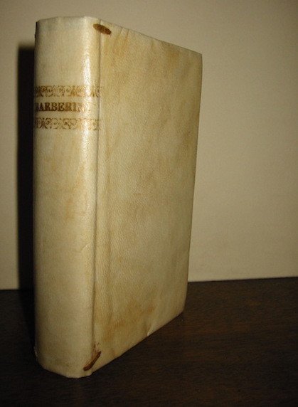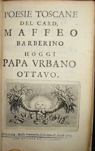 12mo (cm. 13,5), 12 cc.nn., 323(1) pp. Stemma papale al frontespizio, vignetta calcografica a p. 1 (raffigurante due api aggiogate ad un aratro, tema preso dalla bellissima tavola dell’editio maior del 1631) ed alcuni finalini xilografici (segue) Poesie toscane del Card. Maffeo Barberino hoggi Papa Urbano VIII, ibidem 1640, 10 cc.nn., 110 pp., 1 c.nn. Vignetta calcografica al frontespizio e numerosi finalini in xilografia. Legatura recente in pergamena floscia con titolo impresso in oro al ds. Firmetta di appartenenza al frontespizio. Esemplare in ottimo stato di conservazione. Tra le varie composizioni presenti nei ‘Poemata’ vale la pena ricordare la celebre ‘Adulatio Perniciosa’ composta nel 1620 e dedicata a Galileo Galilei di cui poi - una volta raggiunto il soglio pontificio - diventare uno dei principali persecutori. Vinciana, nn. 3158 e 2676; Br. Libr., p. 927.