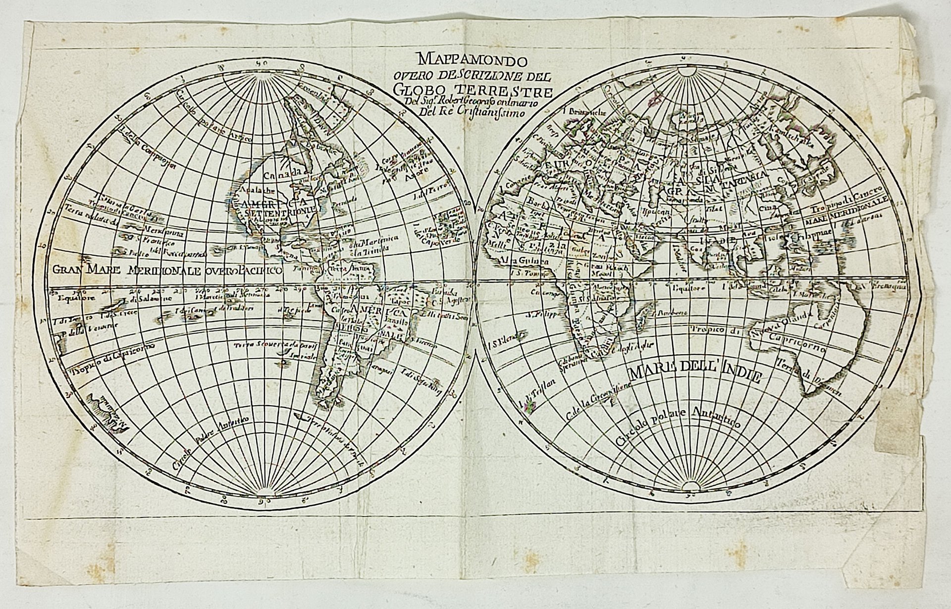 Antica originale carta geografica, presumibilmente risalente a metà del '700, raffigurante il globo terrestre.; Essendo in possesso di altra mappa di identica provenienza risalente al 1761, e da ricerche effettuate sul web, deduciamo che anche questa fu stampata a Venezia da Remondini. Incisione all'acquaforte. Dimensioni del foglio: 30,5 x 18,5 cm circa. Non incorniciata. Stato di conservazione: evidenti difetti (strappi e piccole mancanze) sul margine bianco destro del foglio, una piccola riparazione realizzata tramite una strisciolina di carta, sempre sul margine destro. Qualche leggera ossidazione della carta. Un'orecchia sull'angolo inferiore sinistro. Due minuscoli forellini (visibili solo in trasparenza sulle linee di piegatura. Nel complesso, un discreto esemplare. Verso bianco. Meritevole di essere inquadrata ed esposta.