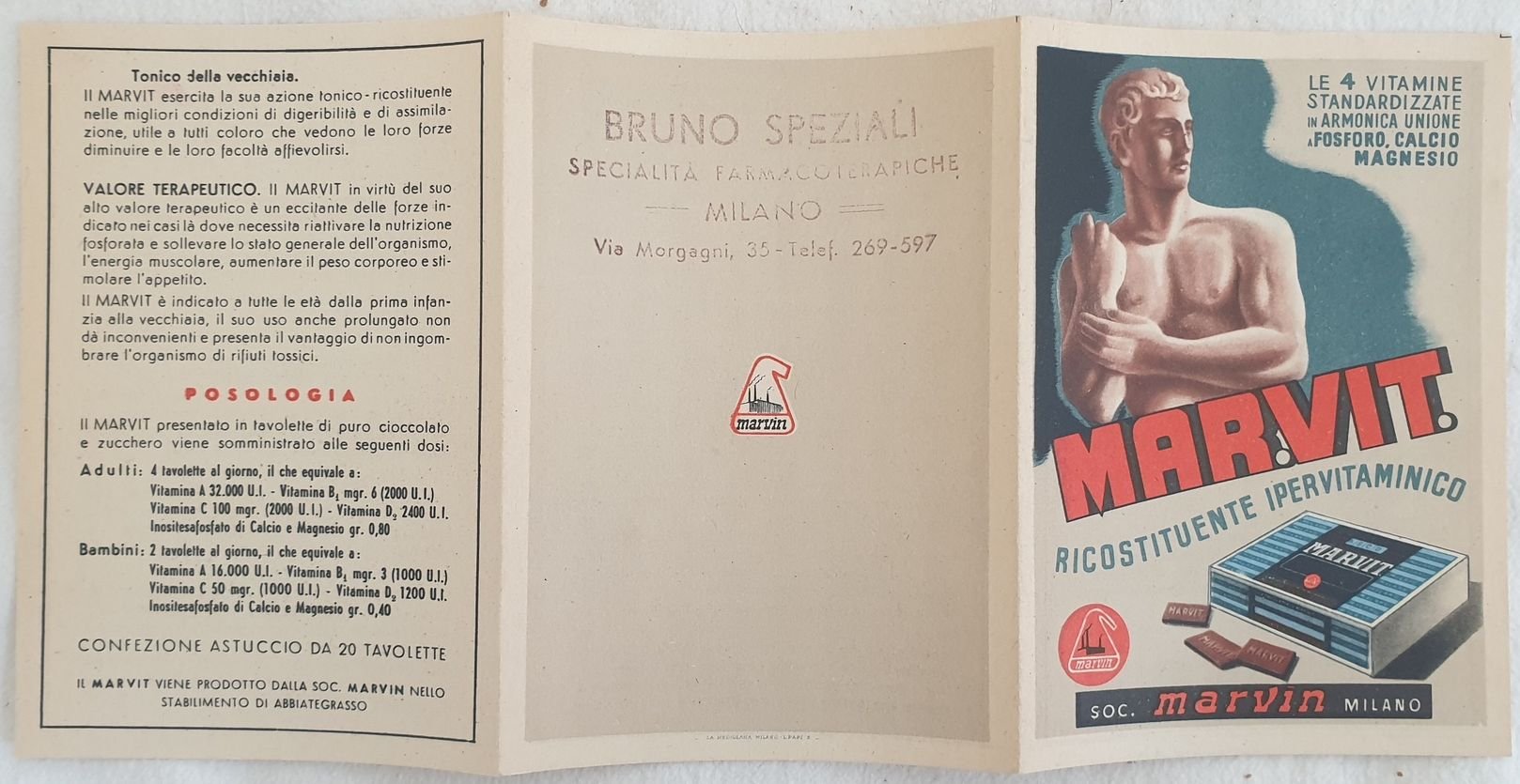 Pubblicità pieghevole degli anni '60 del multivitaminico ricostituente Mar.vit della Soc. Marvin stabilimento di Abbiategrasso. All'interno descrizione dell'integratore. In ottime condizioni. In 16. Dim. 14x10 cm. Folded pamphlet of 1960's of multivitamin Mar.vit of Soc. Marvin in the firm of Abbiategrasso. Inside description of the drug. In very good conditions. In 16. Dim. 14x10 cm.