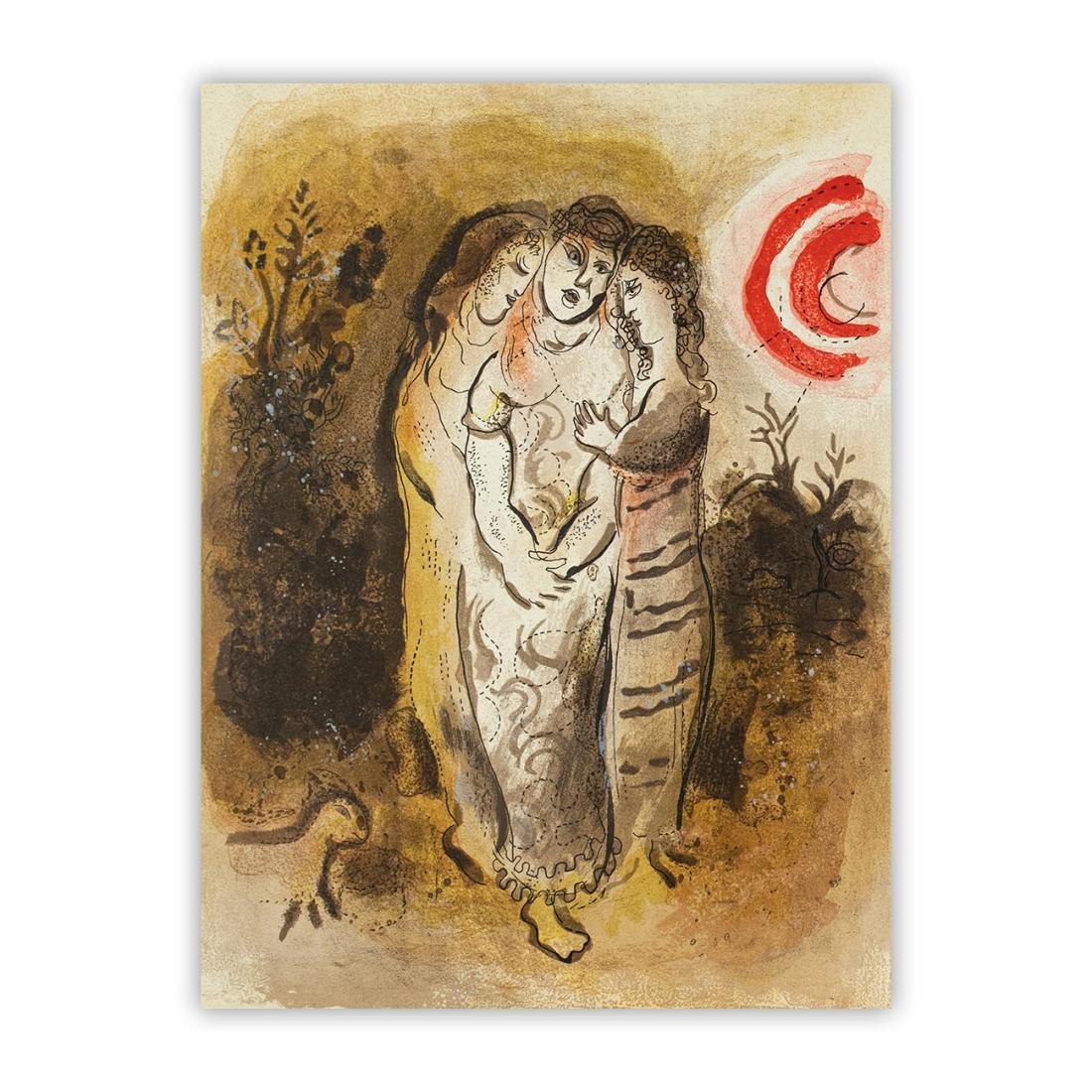 Marc Chagall - Noémi et ses belles-fillesDimensioni: 35,5x26,2 cm Ce double numéro de VERVEcomprend les dessins que Marc CHAGALLa exécutés en 1958 et 1959 sur des thèmes bibliquesqu'il n'avait en général pas traitésdans son illustration pour la Bible, gravée à l'eau-forteet qui fut reproduite dans le numéro 33/34 de Verve.Cet ouvrage comporte 96 reproductions en noir et 24 lithographies en couleurs ainsi que la converturequi ont été spécialement réalisées pour le présent ouvrage.Il a été achevé d'imprimer le 29 Juillet 1960par DRAEGER Frères pour l'héliogravure en noiret par MOURLOT Frères pour la lithographie en couleurs. © VERVE, Paris - France 1960 - printed in France Note: L'opera viene venduta senza cornice, immagine a scopo dimostrativo.