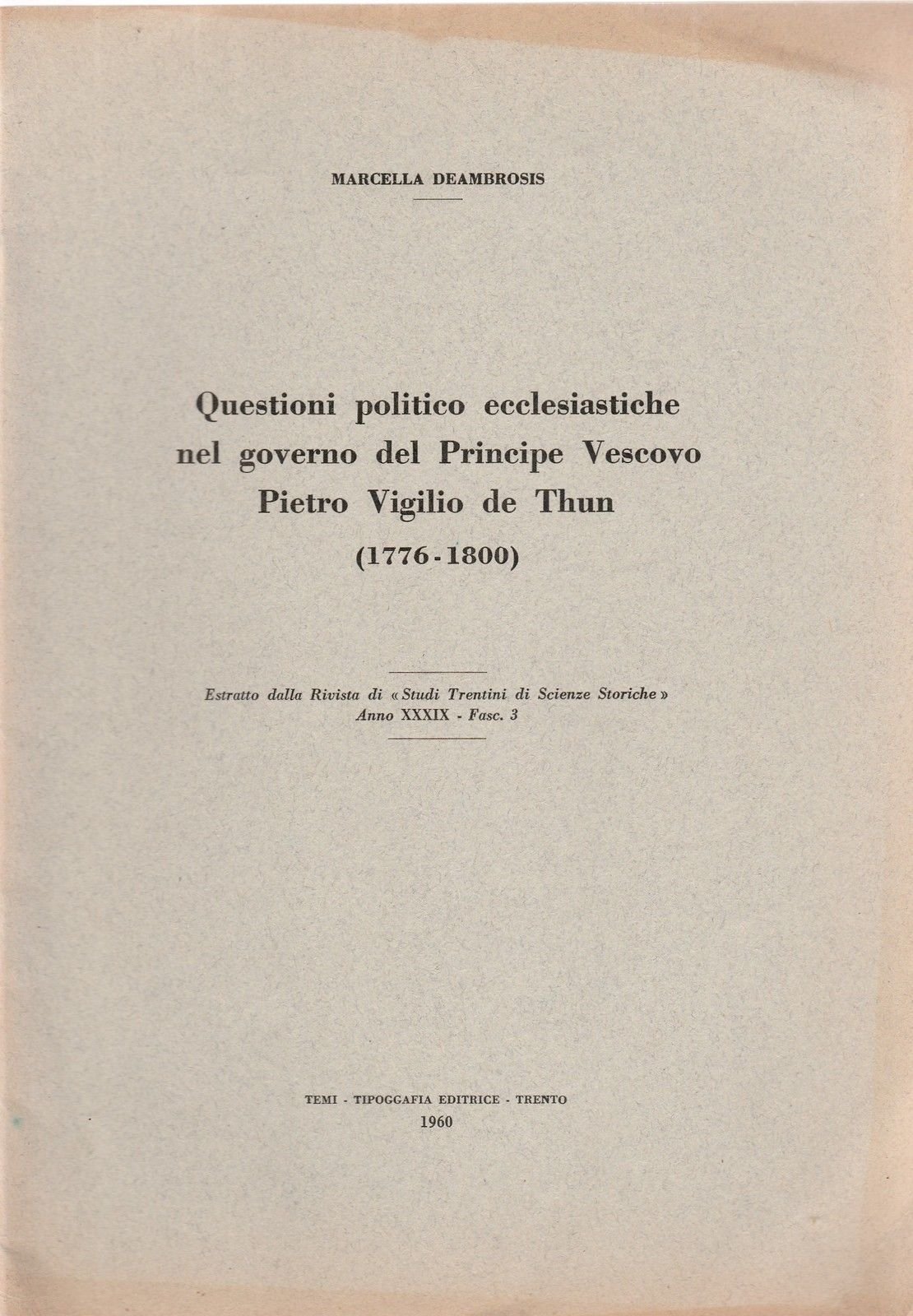 MARCELLA DEAMBROSIS QUESTIONI POLITICO ECCLESIASTICHE NEL GOVERNO DEL PRINCIPE VESCOVO PIETRO VIGILIO DE THUN (1776-1800) ESTRATTO TRENTO 1960L4624 COPERTINA MORBIDA EDITORIALE CON UN ALONE AL MARGINE SUPERIORE IN OTTIMO STATO LEGGERISSIMA PIEGA ALL'ANGOLO SUPERIORE ALLE PRIME PAGINE, TRE CORREZIONI A PENNA NEL TESTO RIGUARDANTE NUMERI E NOMI ALLE ULTIME DUE PAGINE, DA PAG. 227 A PAG. 261 CM. 24 X 17 PER