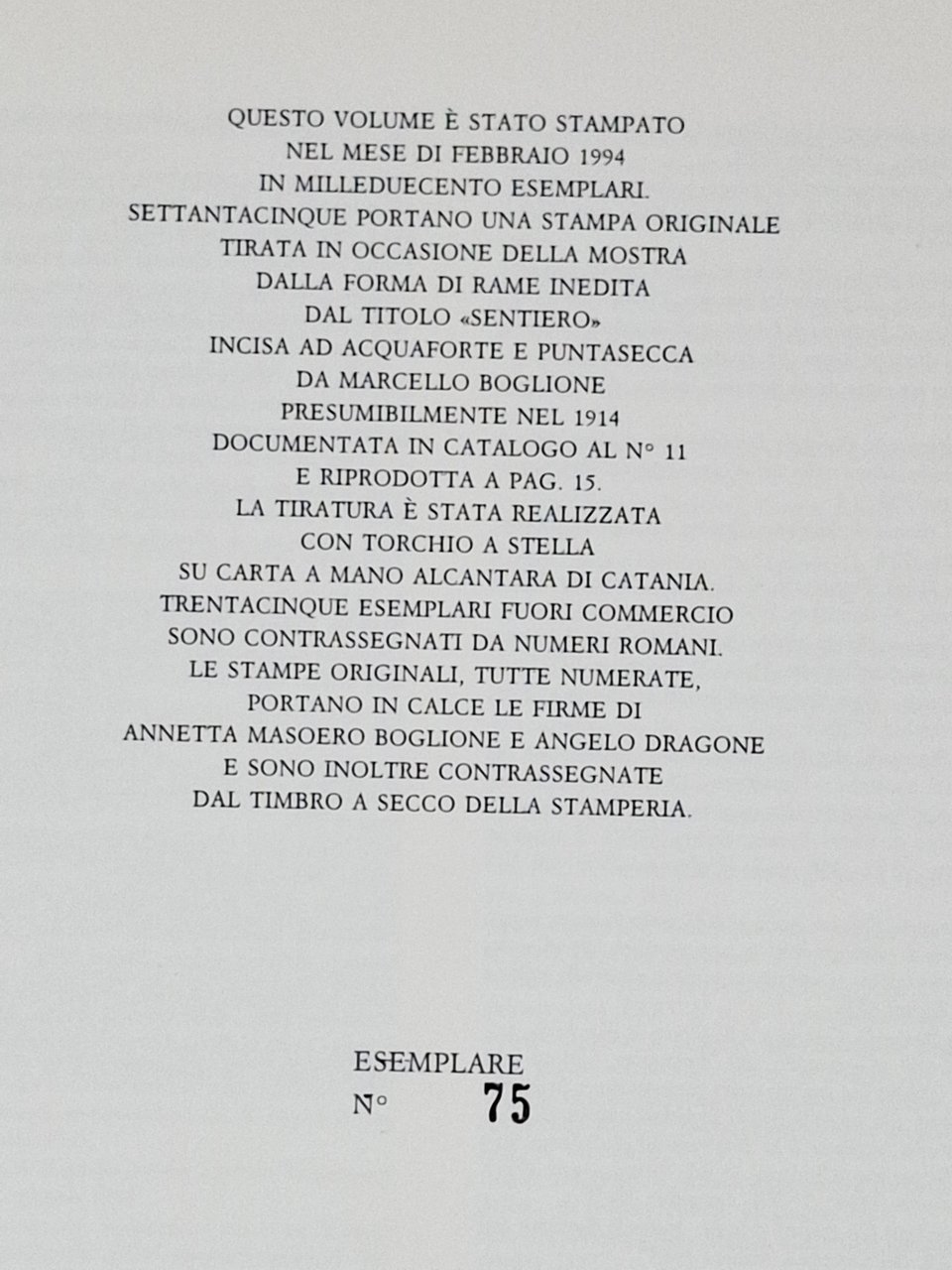 Serie: cataloghi (3). Testi di Angelo Dragone, Franca Dalmasso, Vincenzo Gatti. Con una testimonianza di Francesco Franco e Catalogo generale delle incisioni e delle litografie. Questo volume è stato stampato nel mese di febbraio 1994 in millecinquecento esemplari. Settantacinque portano una stampa originale tirata in occasione della mostra, dalla forma di rame inedita, dal titolo 'Sentiero', incisa ad acquaforte e puntasecca da Marcello Boglione presumibilmente nel 1914. Documentata in catalogo al numero 11 e riprodotta a pagina 15. La tiratura è stata realizzata con torchio a stella su carta a mano alcantara di Catania. L'esemplare posto in vendita fa parte di uno dei 75 esemplari numerati (esemplare numero 75) ed è completo dell'incisione originale firmata a matita da Annetta Masoero Boglione e Angelo Dragone ed è inoltre contrassegnata dal timbro a secco della stamperia. L'incisione è numerata a matita (75/75) e conservata in un'apposita cartellina in carta. Volume ricco di tavole e illustrazioni in nero nel testo. Pagine: 158. Formato del volume: 21,5 x 28,5 cm circa. Dimensioni del foglio su cui è incisa l'acquaforte: 20,5 x 27 cm circa. Dimensioni della battura: 10 x 6,8 cm circa. Stato di conservazione: ottimo il volume e perfetta l'acquaforte. Copertina cartonata rigida illustrata con sovraccoperta illustrata.