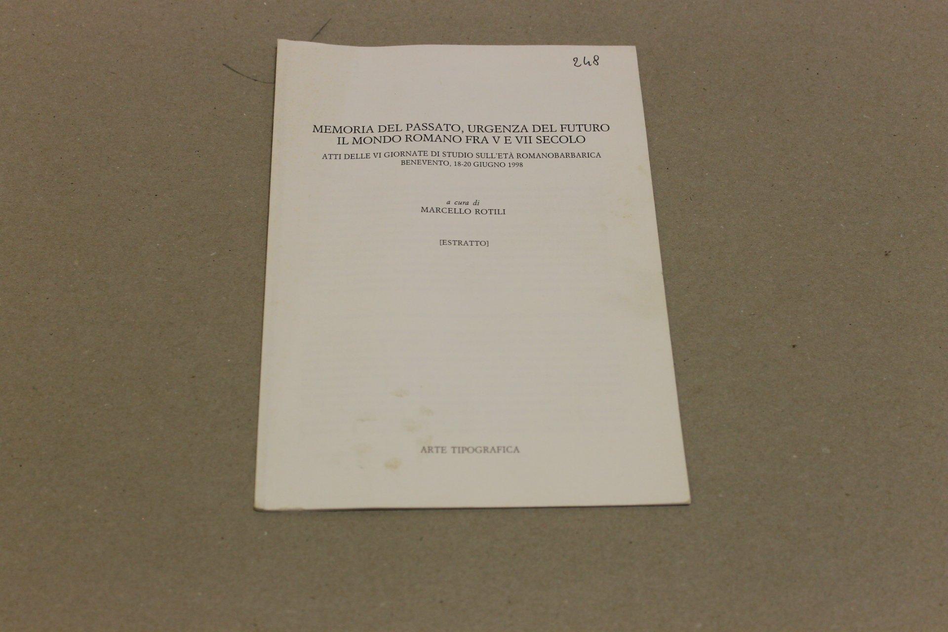 3 a cura di Marcello Rotili Marcello Rotili. Memoria del Passato, urgenza del futuro. il mondo romano fra il V e VII secolo. benevento, Arte Tipografica 1998 italiano, in ottavo 16 Memoria del passato, urgenza del futuro, il mondo Romano fra V e VII secolo.