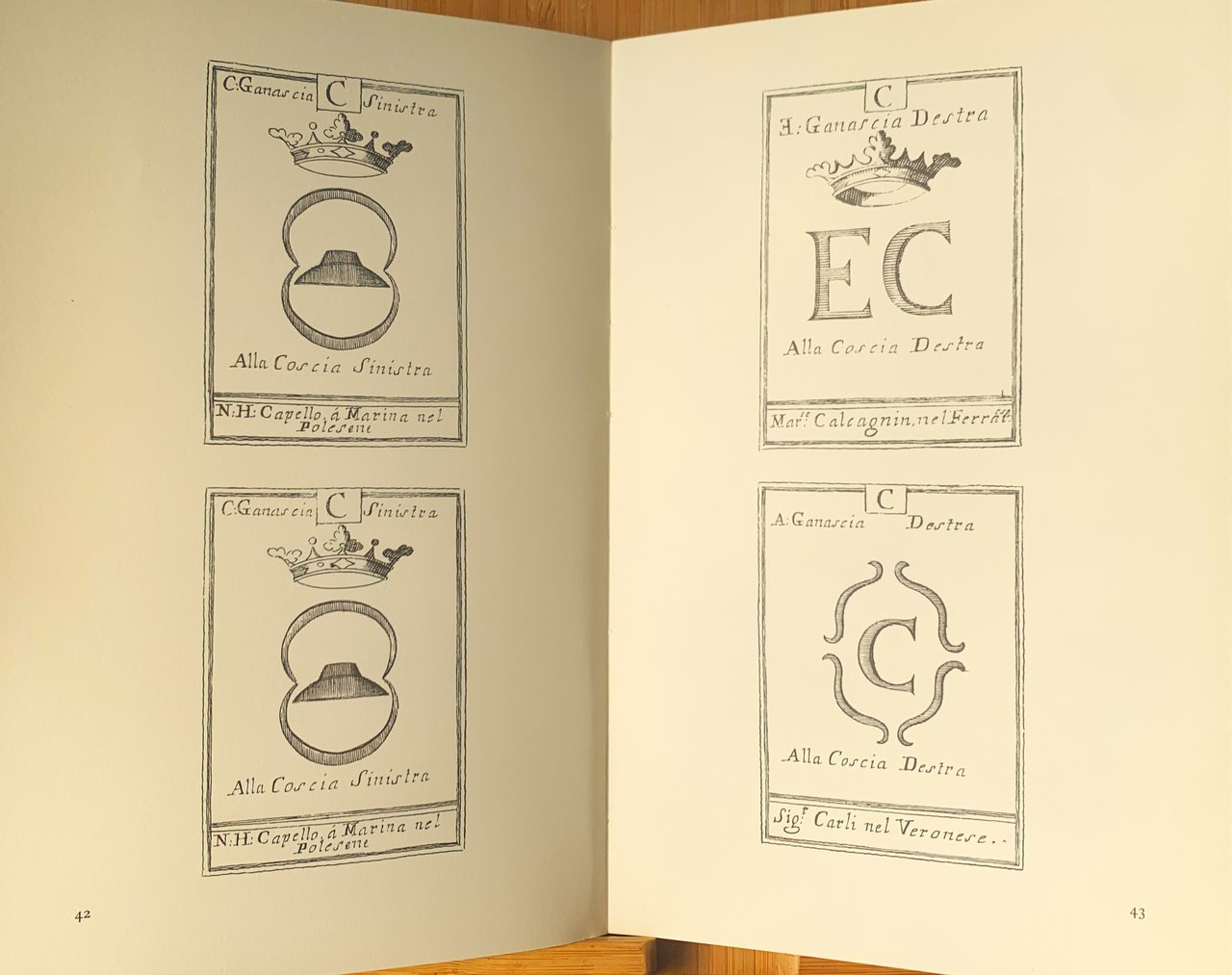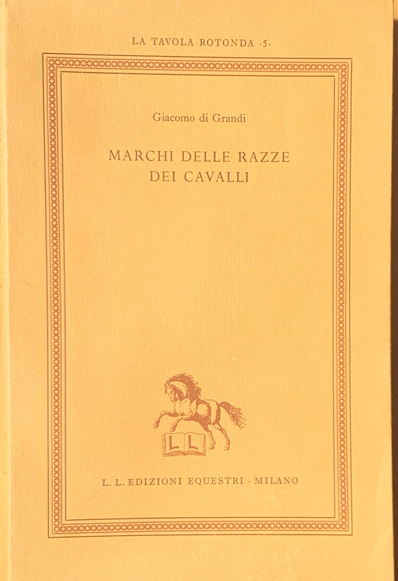 Copia anastatica dell'opera del 1724 "Merchi delle razze de' cavalli, Che preferibilmente si trovano in essere cos' nello Stato Veneto, come nella Lombardia, ed in parte della Romagna. Raccolta Fatta da Giacomo di Grandi nell'Anno 1723 e consacrata A Sua Eccellenza, il Signor Alvise Morosini Senatore Veneto & c. - In Venezia Per Antonio Polidoro, a. S. Soffia. Con Licenza de' Superiori". Tiratura limitata a 750 esemplari numerati (esemplare n. 235). Collana diretta da Lucio Lami riservata ai soci del club "La Tavola Rotonda", vol. 5. In-8, pp. (2) non rilegate con alcune notizie al termine del primo anno di vita del Club a cura di L. L. Editore+120, bross., sovraccoperta color ocra con titoli in nero e marchio figurato dell'Editore in bruno entro cornice in nero e bruno. In antiporta la riproduzione di un'incisione di uno stemma in nero. Stato buono (lieve usura della sovraccoperta ai margini - primo risvolto della sovraccoperta ondulato, nella sua parte superiore leggermente abraso e con uno strato sottile di colla trasparente in un'area rettangolare di ca. 10x7.5 cm come per distacco di un cartiglio). Indice: frontespizio - Eccellenza. Di. V.E. Umil. Devotis.ed Obblig. Serv. Giacomo di Grandi - Al Cortese Lettore - merchi (disegni in nero dei marchi) - Indice. Allegato non rilegato (Cari amici - Spedizioni - Nuove iniziative - Programma 1979 - Notizie liete - Desiderata)