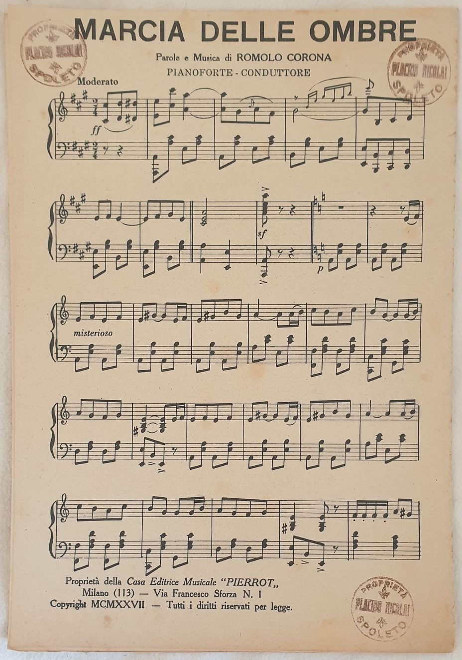 Partitura per orchestra del 1927 della melodia di R. Corona "Marcia delle ombre".<BR>Copertina assente. GENERE: STRUMENTI: pianoforte, violino, violoncello, flauto, clarinetto, tromba, trombone, contrabasso, batteria<BR>ANNO: 1927 DIMENSIONI: In 8. cm 25,5x18 PAGINE: pp. 11 CONDIZIONI: Buone condizioni. Copertina assenteScore for orchestra of 1927 of the melody of R. Corona "Marcia delle ombre". Cover lacks. MUSIC:STRUMENTI: piano, violin, violoncello, flute, clarinet, trumpet, trombone, contrabass, drums<BR>YEAR: 1927 SIZE: In 8. cm 25,5x18 PAGES: pp. 11 CONDITIONS: Good conditions. Ex libris in the cover