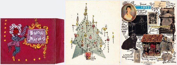 biglietto di auguri e busta illustrati a mano da Marco Biassoni; il biglietto è in formato 17X20e presenta all'interno un collage; la busta è in formato 23X19,5 cm circa; buoni ess.