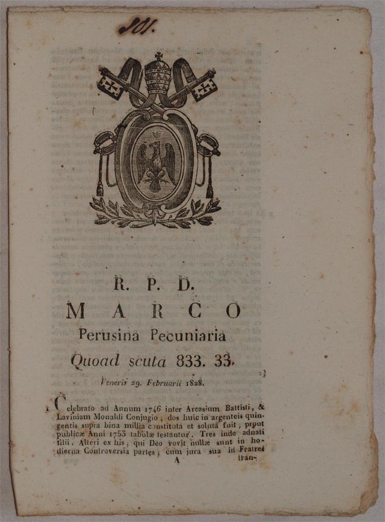 In 4. Dim. 28,5x21 cm. Pp. (6). Interessante pubblicazione del 1828, una sentenza del Tribunale della Sacra Rota del 29 Febbraio 1828 per una causa nella diocesi di Perugia Si tratta della causa per l'eredità dei coniugi Arcasio Battisti e Lavinia Monaldi che lasciarono tutto ai figli nominando come divisore Tommaso Arezzo governatore della provincia. Il figlio alsciò tutto alla Sagrestia della Chiesa Cattedrale di San Lorenzo a Perugia. In buone condizioni. Copertina assente. Legatura assente. All'interno le pagine si presentano in buone condizioni con fioriture e bruniture. In barbe. Interesting pamphlet of 1828, a sentence of the Trial of Sacra Rota for a trial of 29th of february 1828 in the diocesis of Perugia. It is the trial for the heredity of the married people Arcasio Battisti and Lavinia Monaldi who left everything to sons naming divisor Tommaso Arezzo governor of the province. The son left everything to the Sagrestia della Chiesa Cattedrale di San Lorenzo in Perugia. In good conditions. Cover is missing. Binding is missing. Inside pages are in good conditions with foxings and yellowings. Uncut copy.
