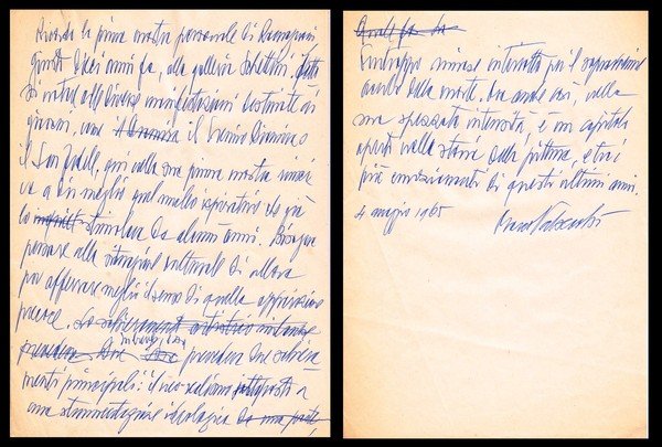 recensione manoscritta e firmata di 14 pagine del critico Marco Valsecchi sull'artista Bepi Romagnoni (Milano 1931 - Capo Carbonara 1964); recensione datata 4 Maggio 1965; buon es.