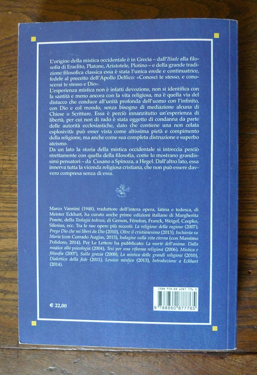 Marco Vannini,STORIA DELLA MISTICA OCCIDENTALE.Editoriale Le Lettere, Firenze 2020, ristampa,edizione rivista, aggiornata e ampliata,brossura, 21,5x14,5 cm., pp.459,collana SAGGI,ISBN: 978-88-6087-776-5,peso: g.700cod.3044CONDIZIONI DEL LIBRO: come nuovodalle note editoriali:L'origine della mistica occidentale è in Grecia — dall'Iliade alla filosofia di Eraclito, Piatone, Aristotele, Piotino — e della grande tradizione filosofìca classica essa è stata l'unica erede e continuatrice, fedele al precetto dell'Apollo Delfico: "Conosci te stesso, e conoscerai te stesso e Dio". L'esperienza mistica non è infatti devozione, non si identifica con distacco che conduce all'unità profonda dell'uomo con l'infinito, con Dio e col mondo, senza bisogno di mediazione alcuna di Chiese o Scritture. Essa è perciò innanzitutto un'esperienza di libertà, per cui non di rado e stata oggetto di condanna da parte delle autorità ecclesiastiche, dato che contiene una non celata esplosività: può esser vista come altissima pietà e compimento della religione, ma anche come sua completa distruzione e superbo ateismo.Da un lato la storia della mistica occidentale si intreccia perciò strettamente con quella della filosofia, come lo mostrano grandissimi pensatori — da Cusano a Spinoza, a Hegel. Dall'altro lato, essa innerva tutta la vicenda religiosa cristiana, che non può essere davvero compresa senza di essa.