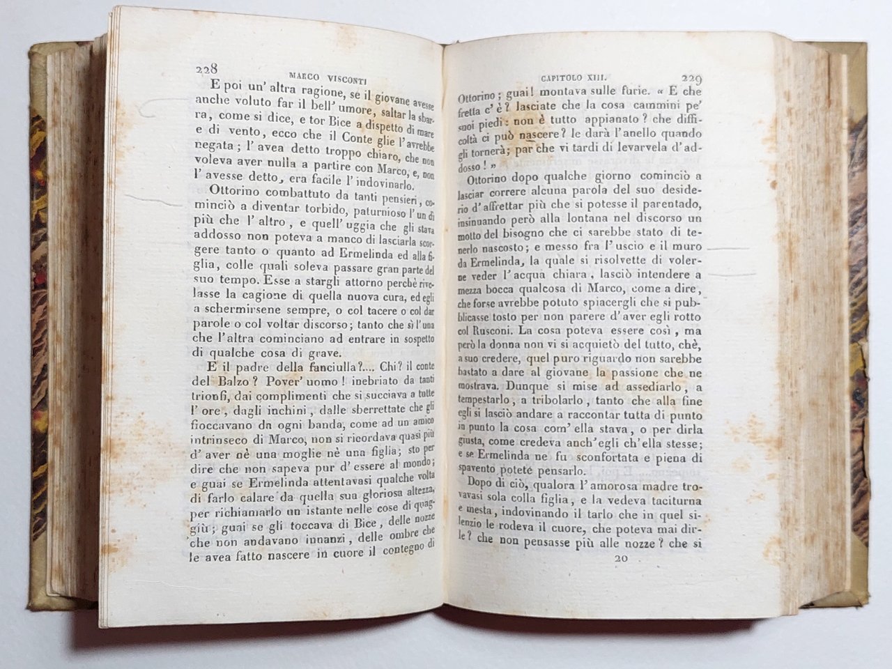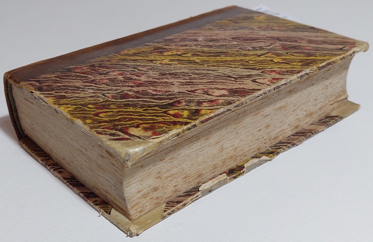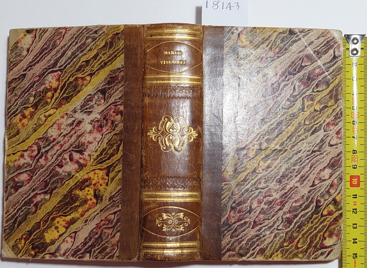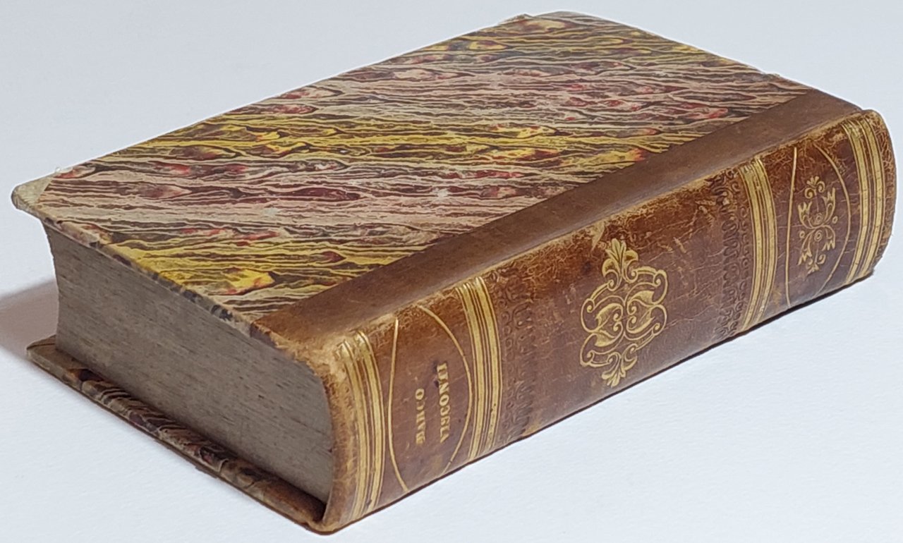 legatura rigida in mezza pelle con piatti marmorizzati in discreto stato, alcune lievi abrasioni, rotture alle unghie, punte in pelle color avorio, dorso in pelle marrone con fregi e nome dell'autore in oro, in discreto stato, segni di usura e lievi segni del tempo, tagli leggermente bruniti con fioriture, impolverati quindi superiori, interno in discreto stato, fioriture alle pagine interne che non vanno a disturbare la lettura, vecchia firma di possesso alla prima pagina, antiporta incisa da Gaetano Bonatti su disegno di De Marchi, frontespizio con incisione fioriture diffuse, numero di catalogazione a matita al margine inferiore, segni a matita al margine esterno del testo su quasi tutto il libro, un lieve alone di umidità all'angolo superiore delle pagine, numero pagine 602 dimensioni 15,5 * 10,2 * 4,7